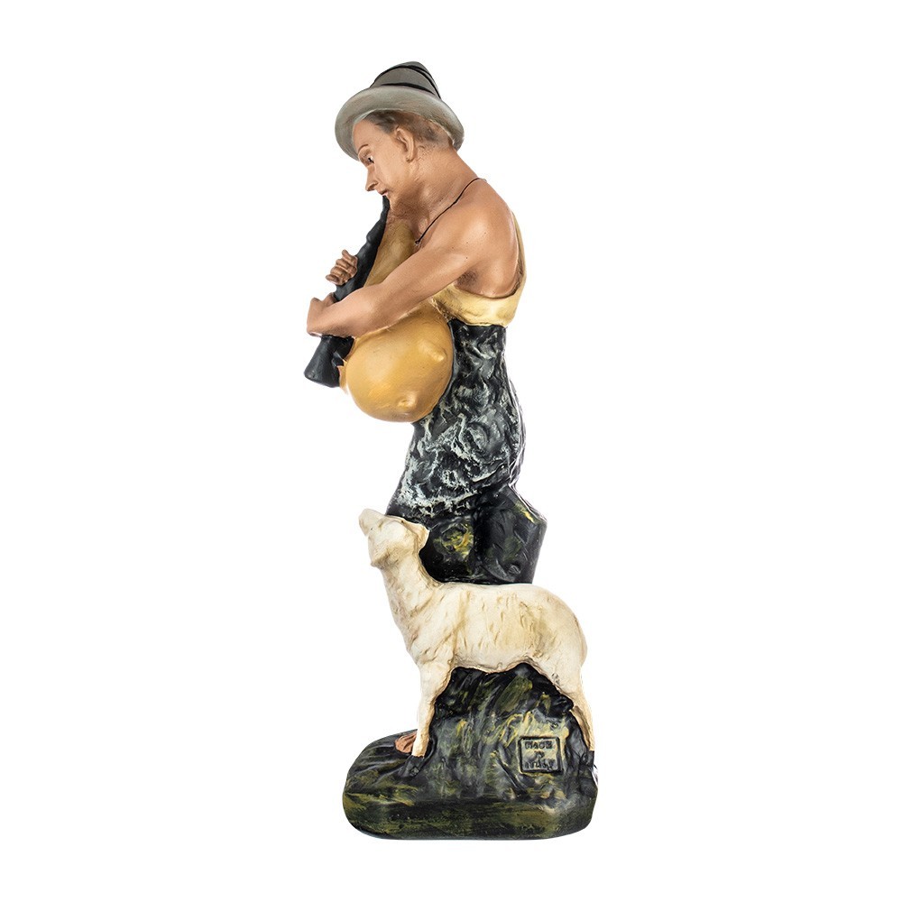 Statua del presepe in gesso: Pastore zampognaro con cane 20 cm.