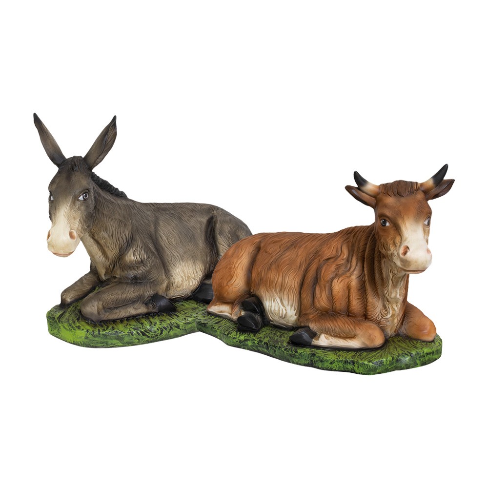 Bue e asinello in resina vuota dipinti finemente a mano con colorazione acrilica indelebile.