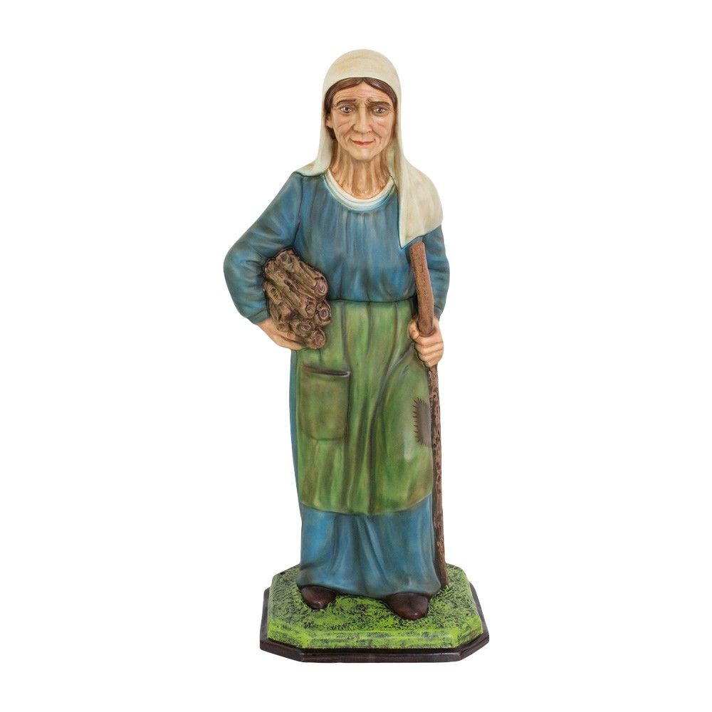Statua pastorella anziana con legna in resina vuota proporzionata per il presepe napoletano con altezza 100 cm.