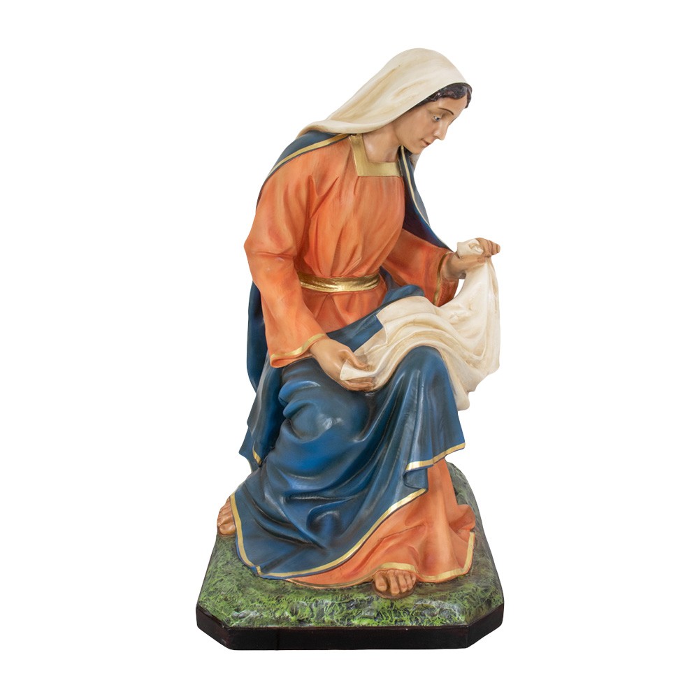 La Madonna si presenta seduta con occhi in cristallo, manto blu e bordi dorati. Proporzionata per la natività del presepe con altezza 160 cm.