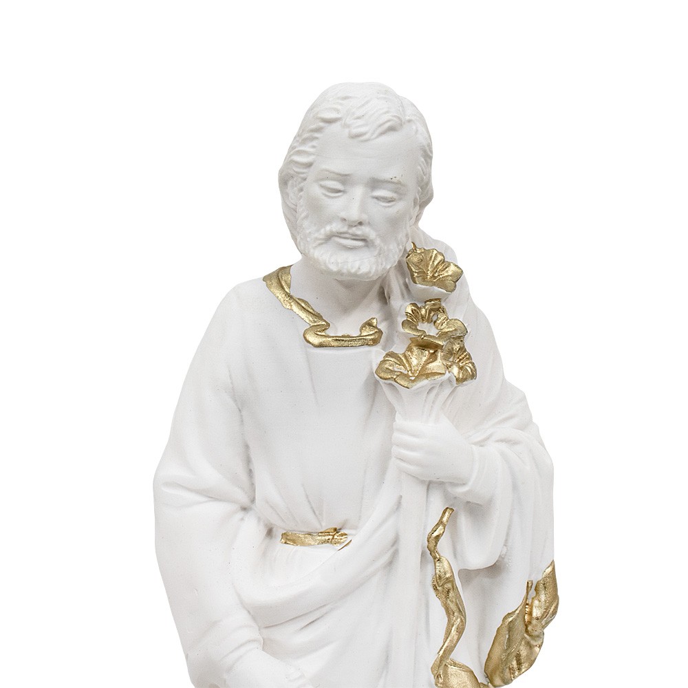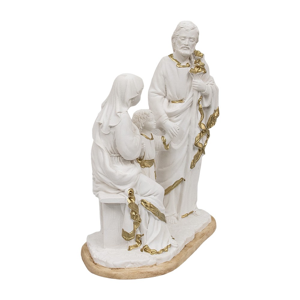 Statuetta dela Sacra famiglia in resina bianca con base dorata.