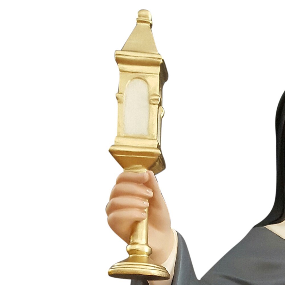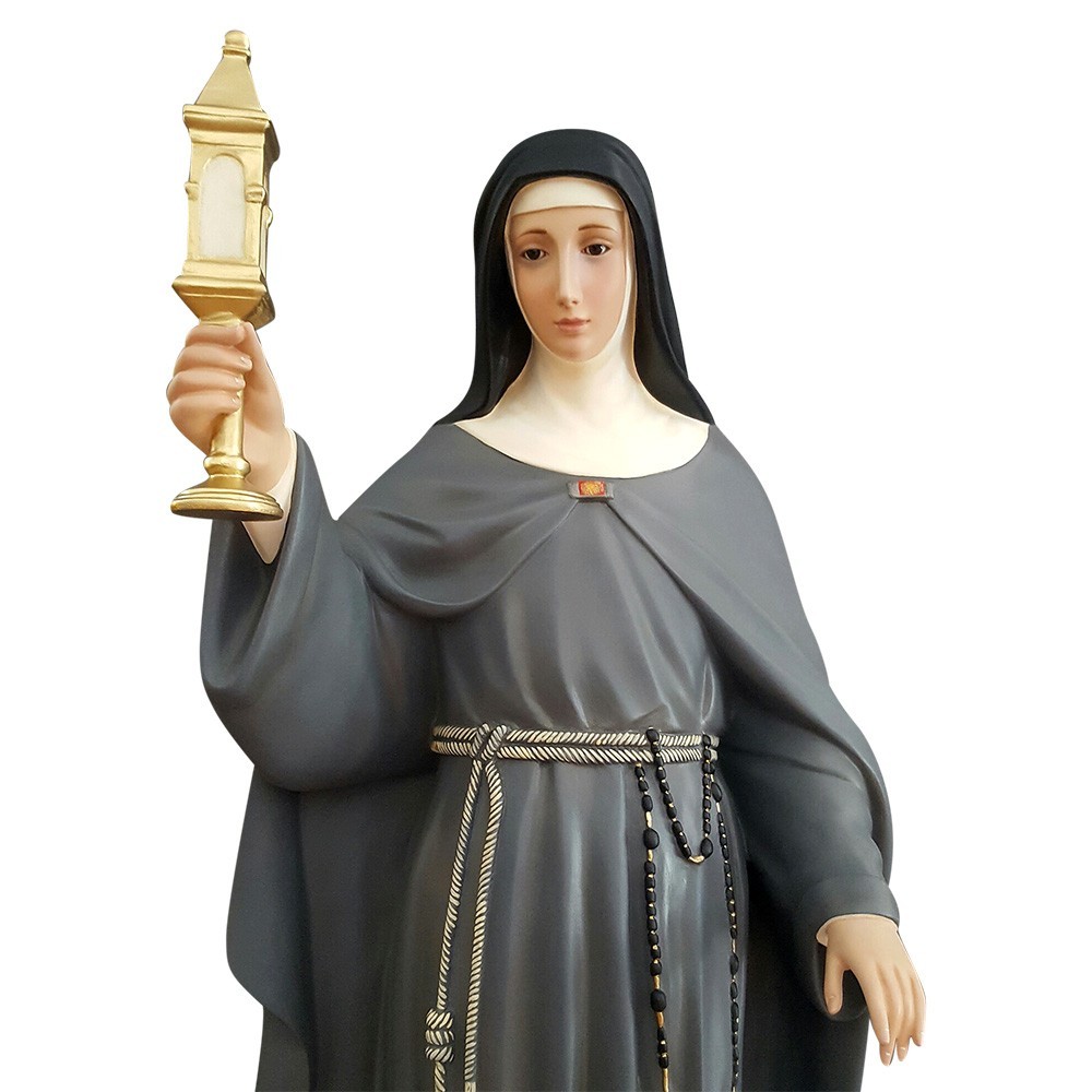 Statua di Santa Chiara alta 130 realizzata n vetroresina, un materiale estremamente leggero e resistente alle intemperie e agli agenti atmosferici, quindi ideale per l'esterno.
