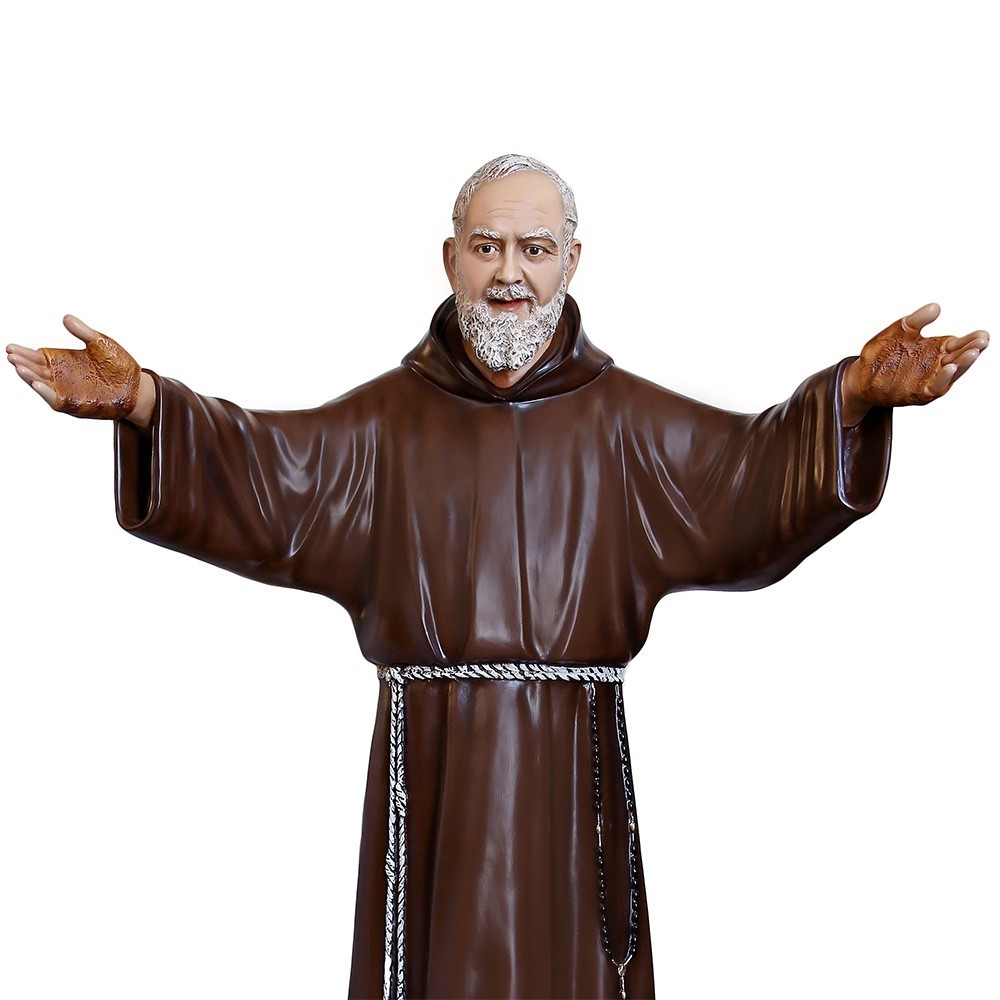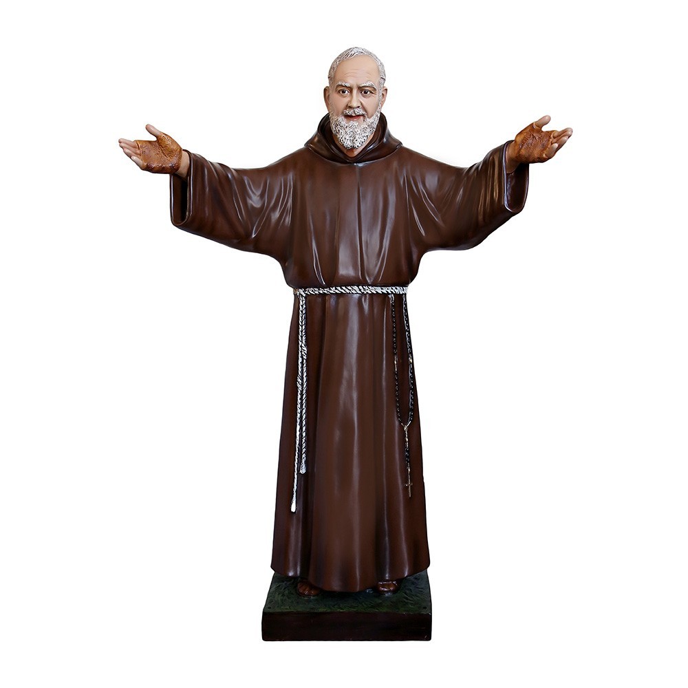 San Pio a braccia aperte in vetroresina, altezza 180 cm. La statua è realizzata in vetroresina è ideale per processioni ed all'interno delle chiese perchè molto leggera.