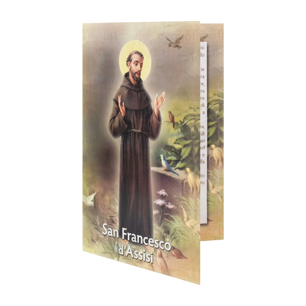 Piccola statua con sagoma in legno raffigurante San Francesco arricchita con dettagli in oro a caldo.