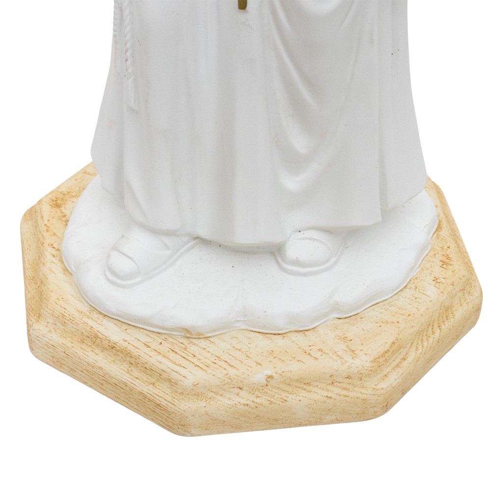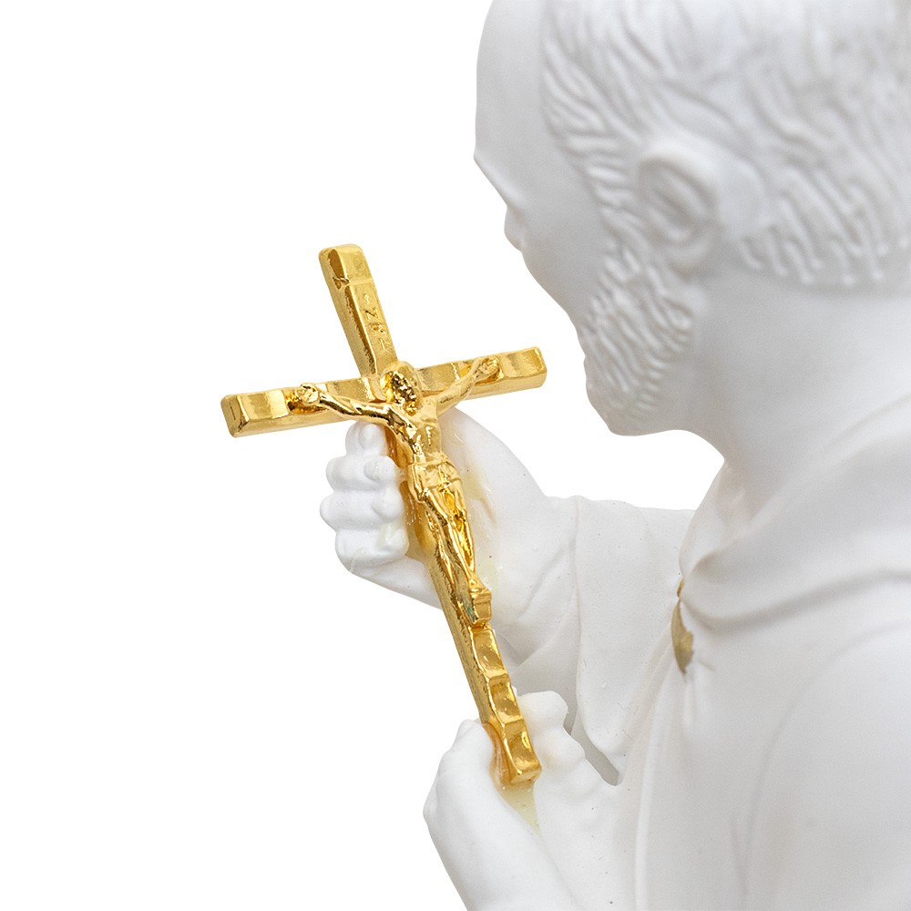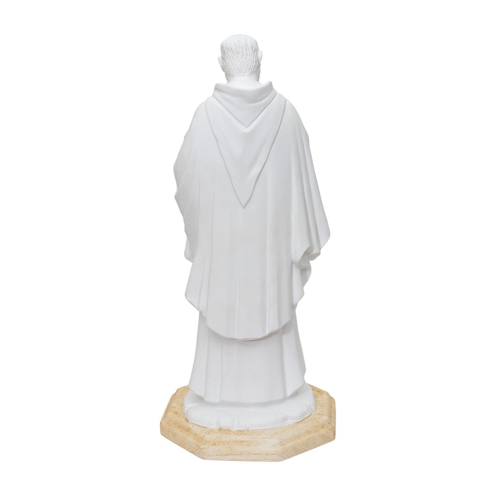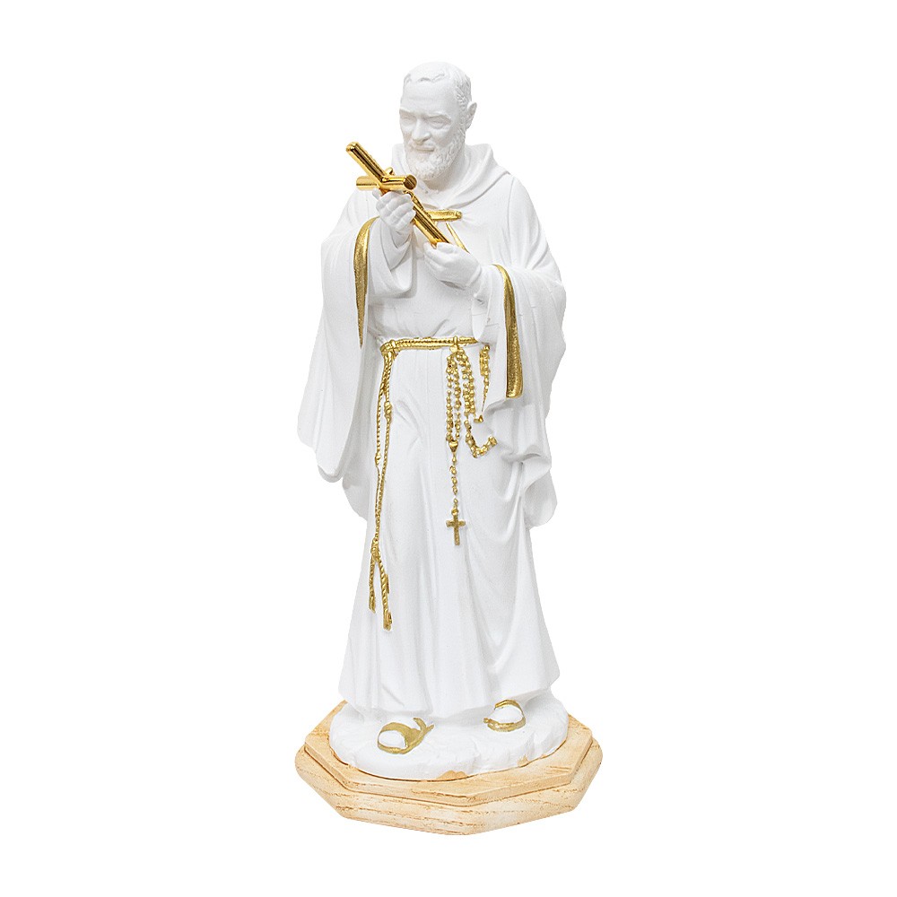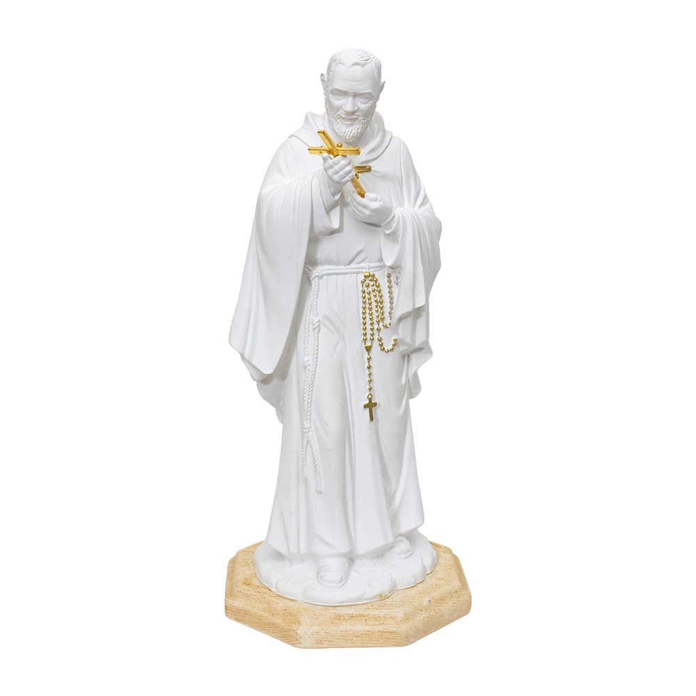 Statua di San Pio in resina dipinta di bianco con croce e coroncina del rosario color oro.