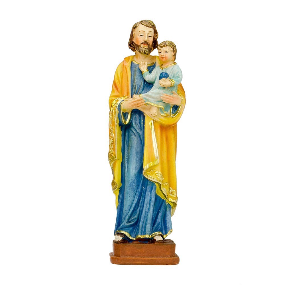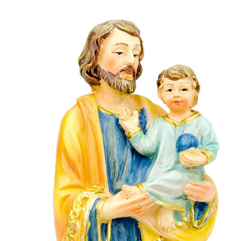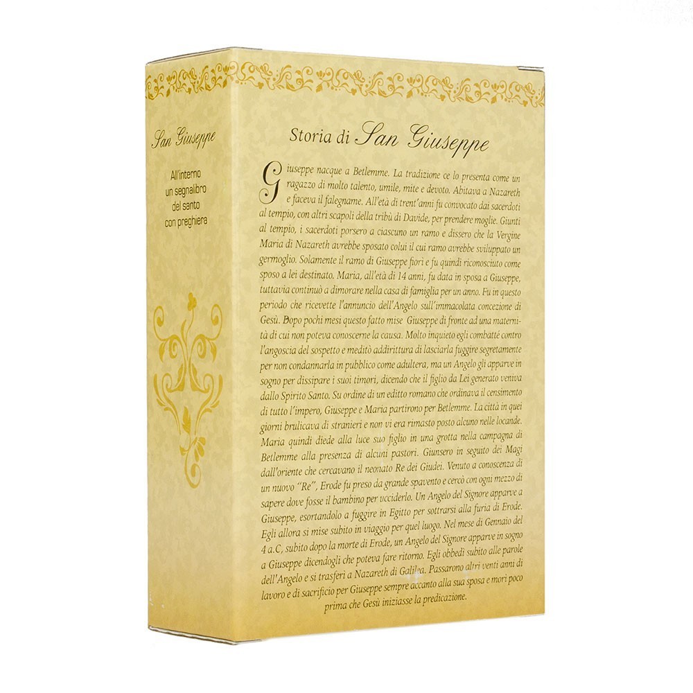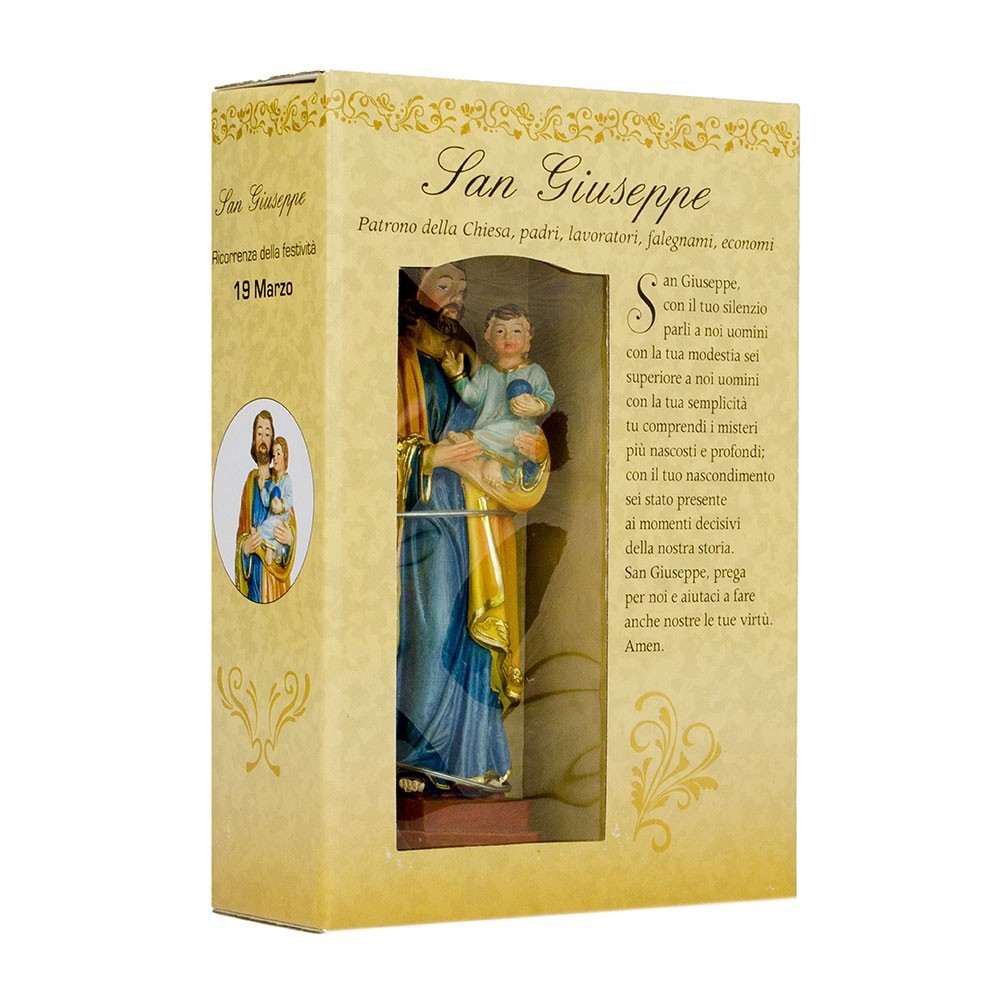 La statuetta di san Giuseppe è in resina ed è confezionata in scatola regalo. La statua è alta 12 cm. All'interno della scatola vi è un grazioso segnalibro con preghiera del Santo. Sulla scatola in cartone è stampata la ricorrenza della festività e la storia di San Giuseppe.