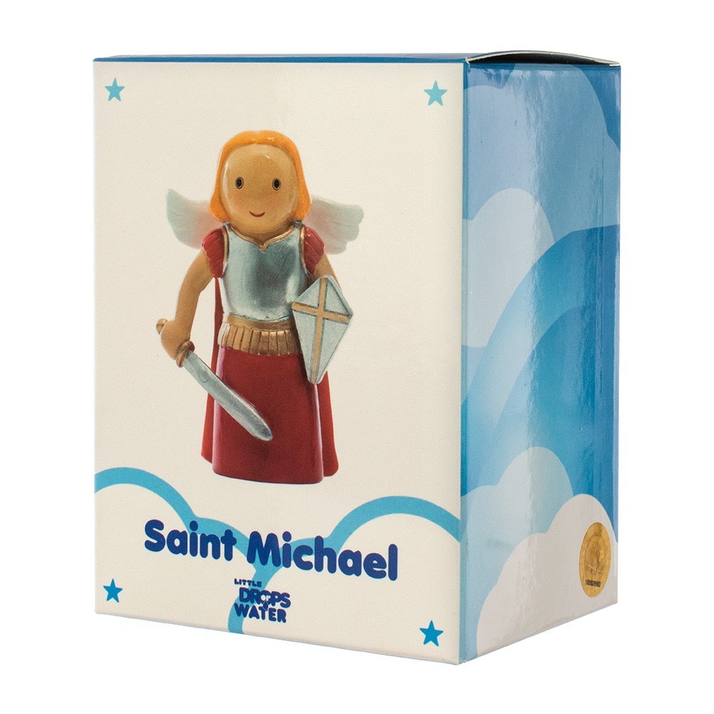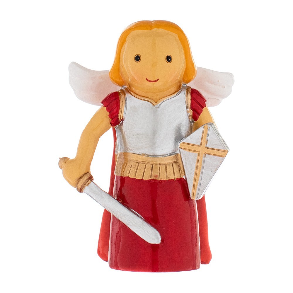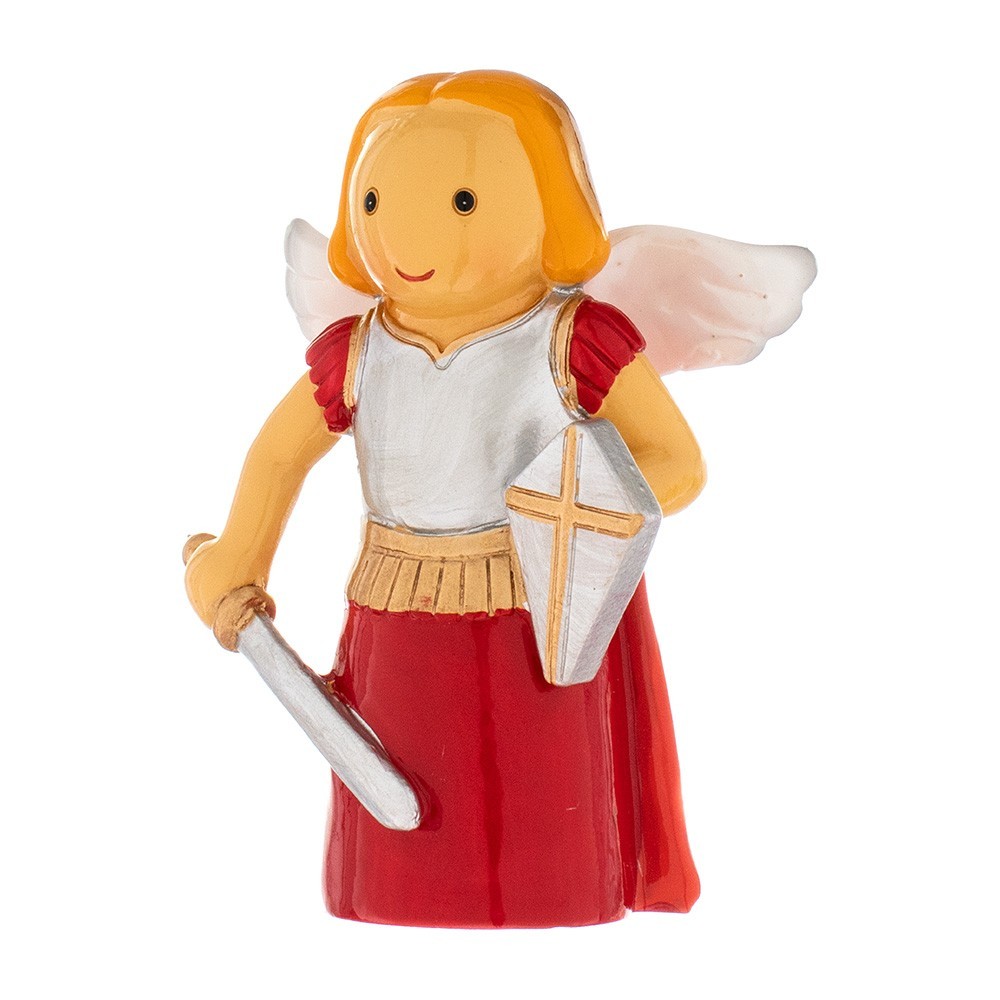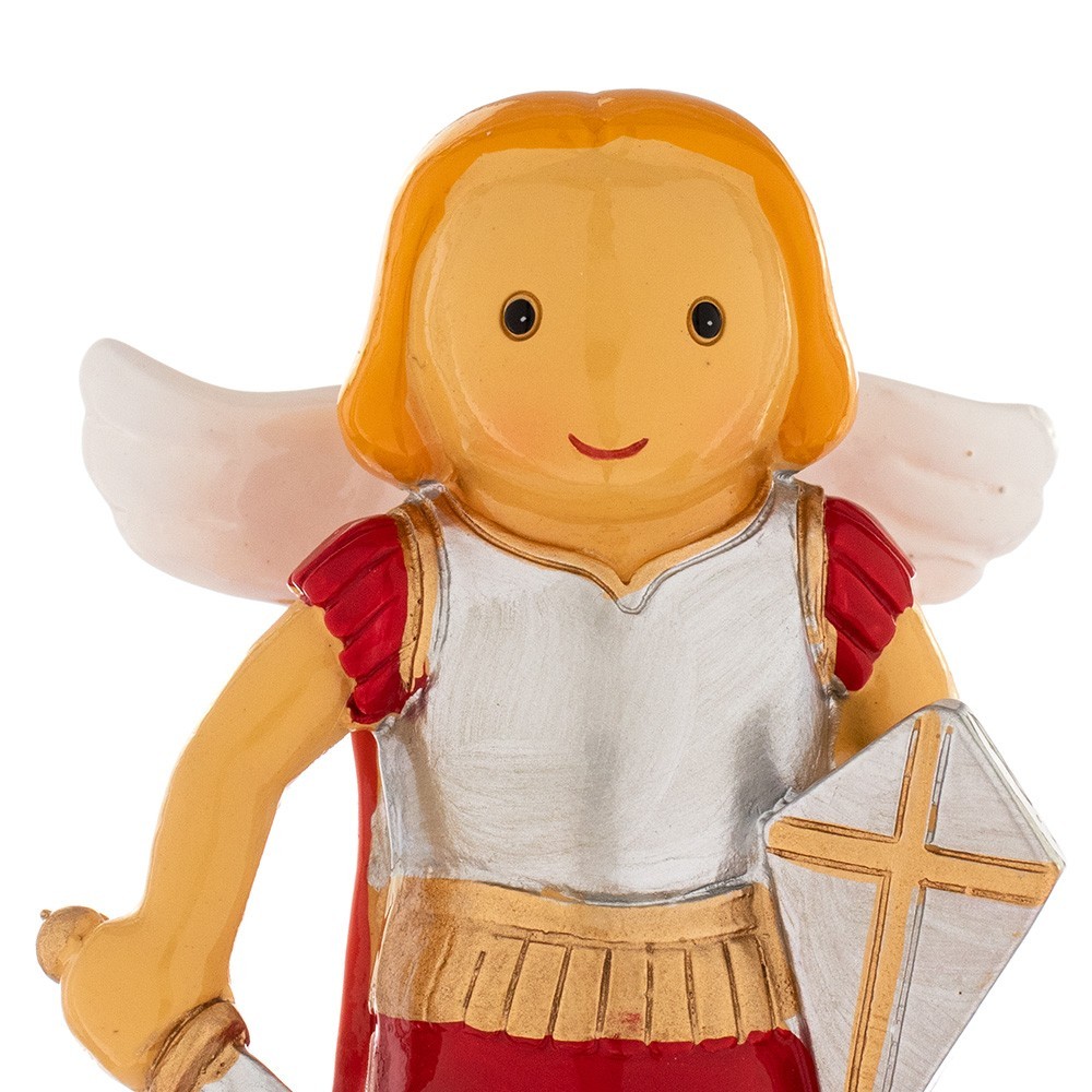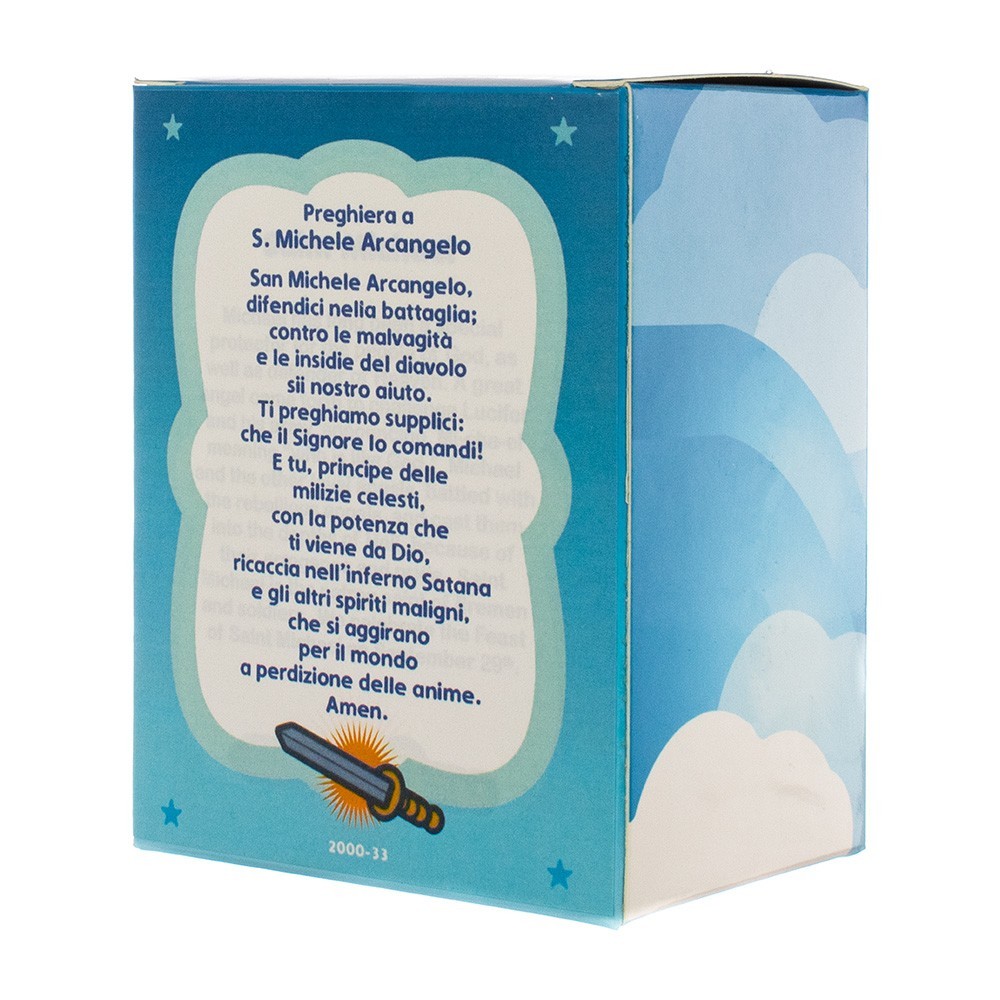 Piccola statua di San Michele Arcangelo in resina colorata. Dipinta a mano e confezionata in una scatola personalizzata. Sul retro della scatola in cartoncino vi è riportata la Preghiera a San Michele Arcangelo. Articolo ideato per bambini per far conoscere in modo semplice i Santi.