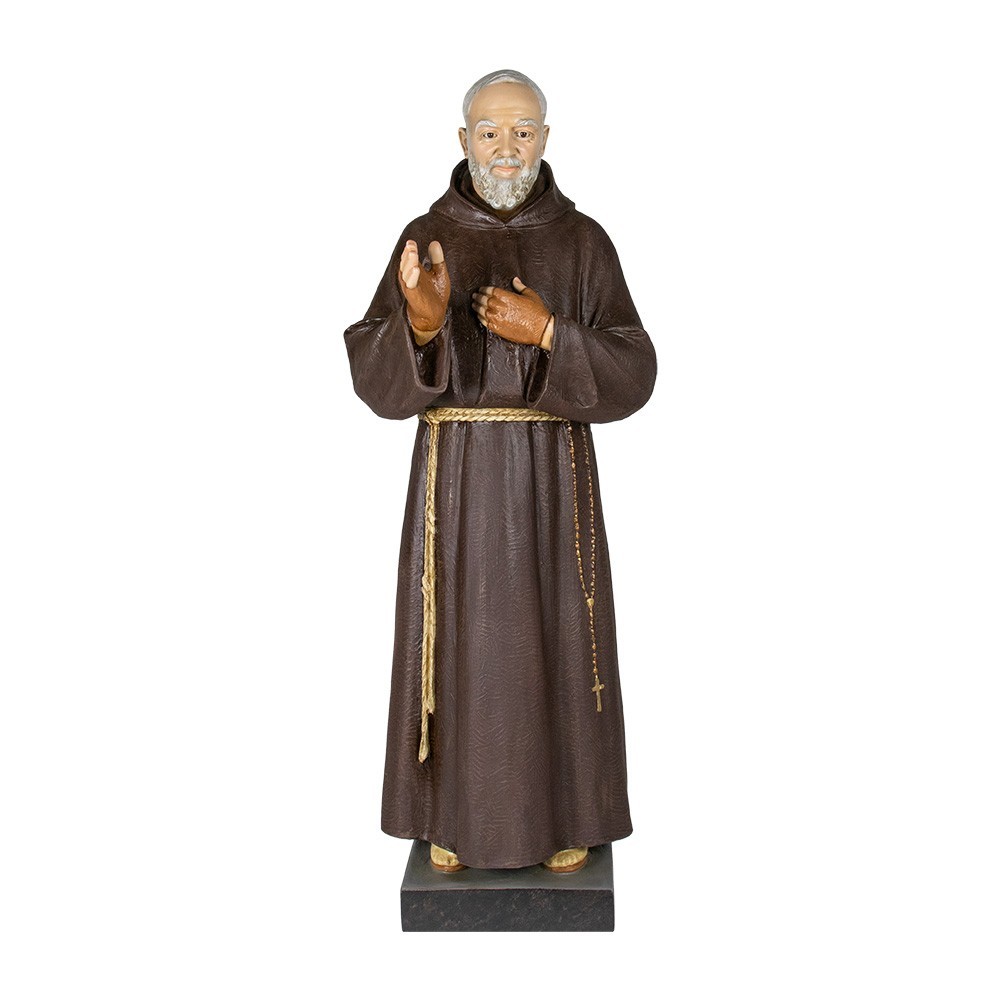 Statua San Pio da Pietrelcina con occhi in vetro realizzata interamente in vetroresina. Questa bellissima statua sacra è dipinta finemente a mano e rifinita nei particolari, ideale per l'esterno perchè estremamente resistente alle intemperie. Ottima per processioni ed all'interno delle chiese perchè molto leggera.