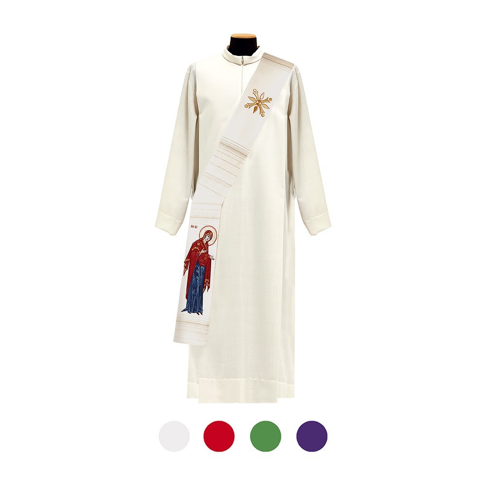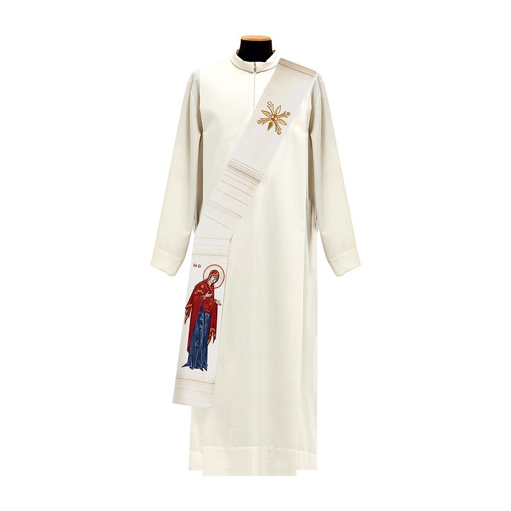 Stola liturgica diaconale finemente ricamata su entrambi i lati. Il ricamo viene eseguito interamente a macchina e raffigura l'immagine sacra di Maria e Giovanni. Realizzata in leggerissimo e fresco tessuto misto lana e seta.