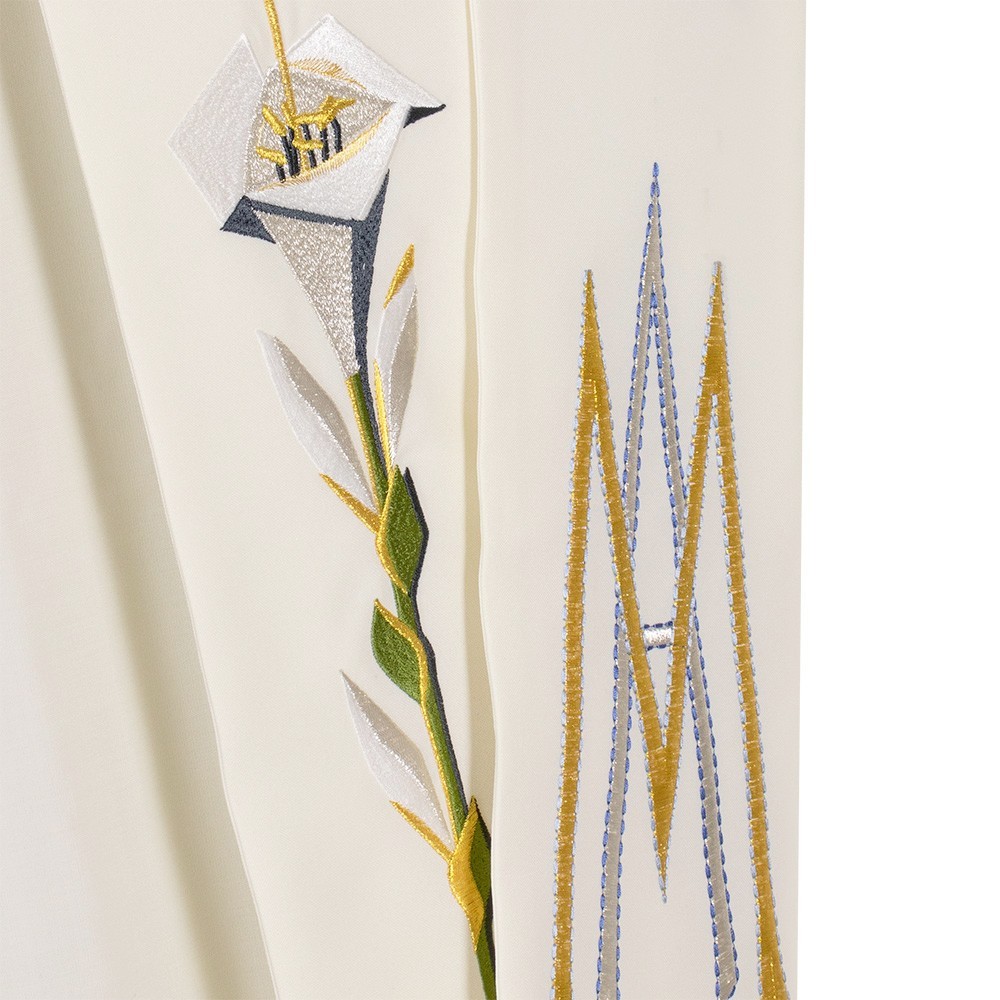 Stola per Diacono con monogramma mariano e giglio confezionata in tessuto poliestere resistente e leggero.