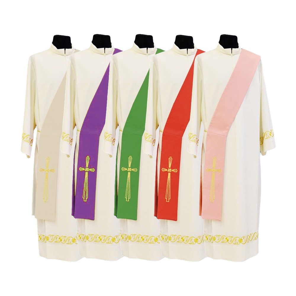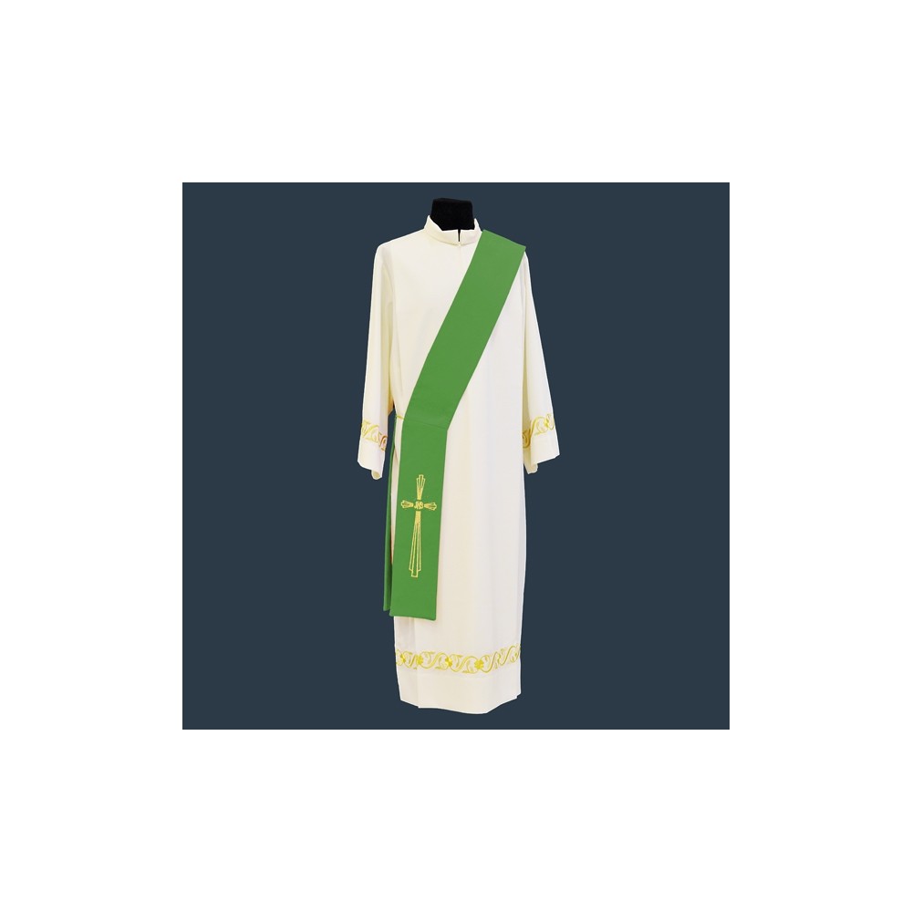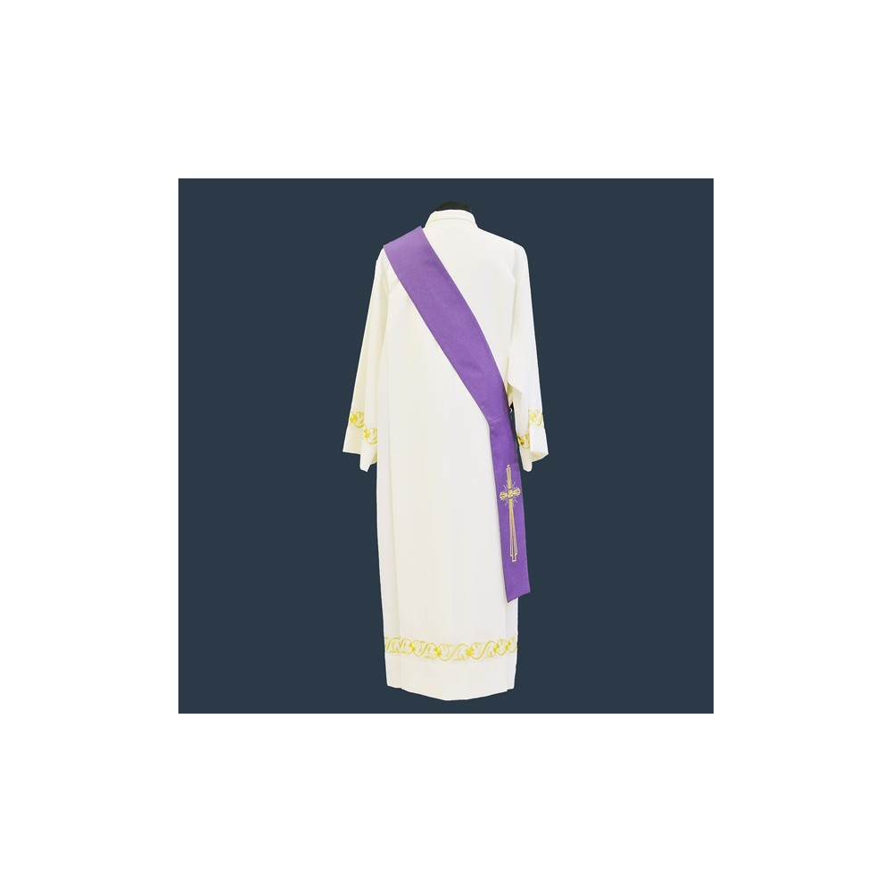 Stola da Diacono realizzata in poliestere, con ricamo dorato sul fronte. I ricami vengono utilizzati con macchine di alta qualità realizzati da una sartoria italiana. Disponibile nei colori liturgici. Made in Italy.