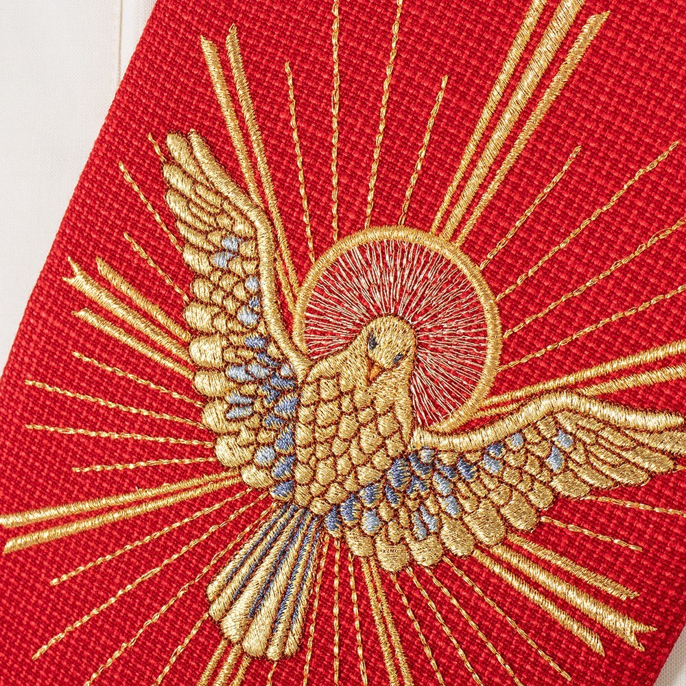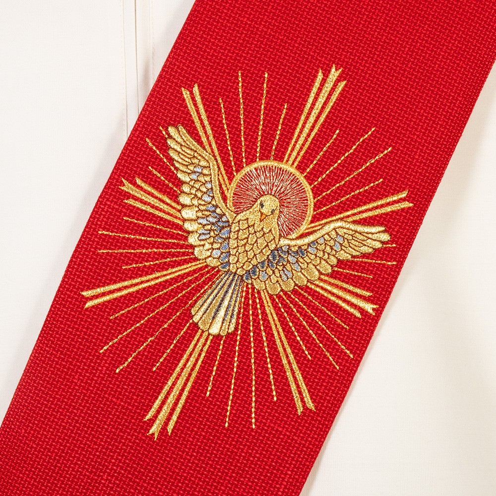 Stola diacono in tessuto misto lana (50% lana e 50% viscosa). Stola con decori dorati sul fronte che rappresentano la Colomba (Spirito Santo) e 7 fiamme. I ricami vengono utilizzati con macchine di altissima qualità. Made in Italy.
