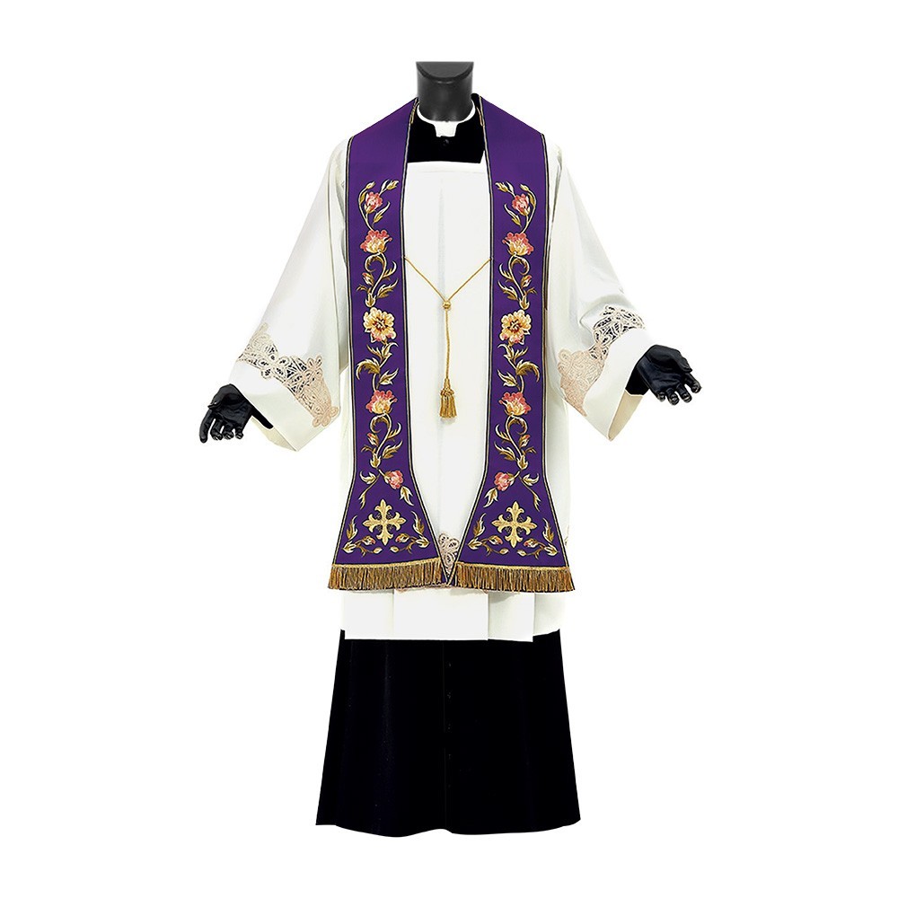 Stola sacerdotale a campana completa di frangia e con ricco ricamo.