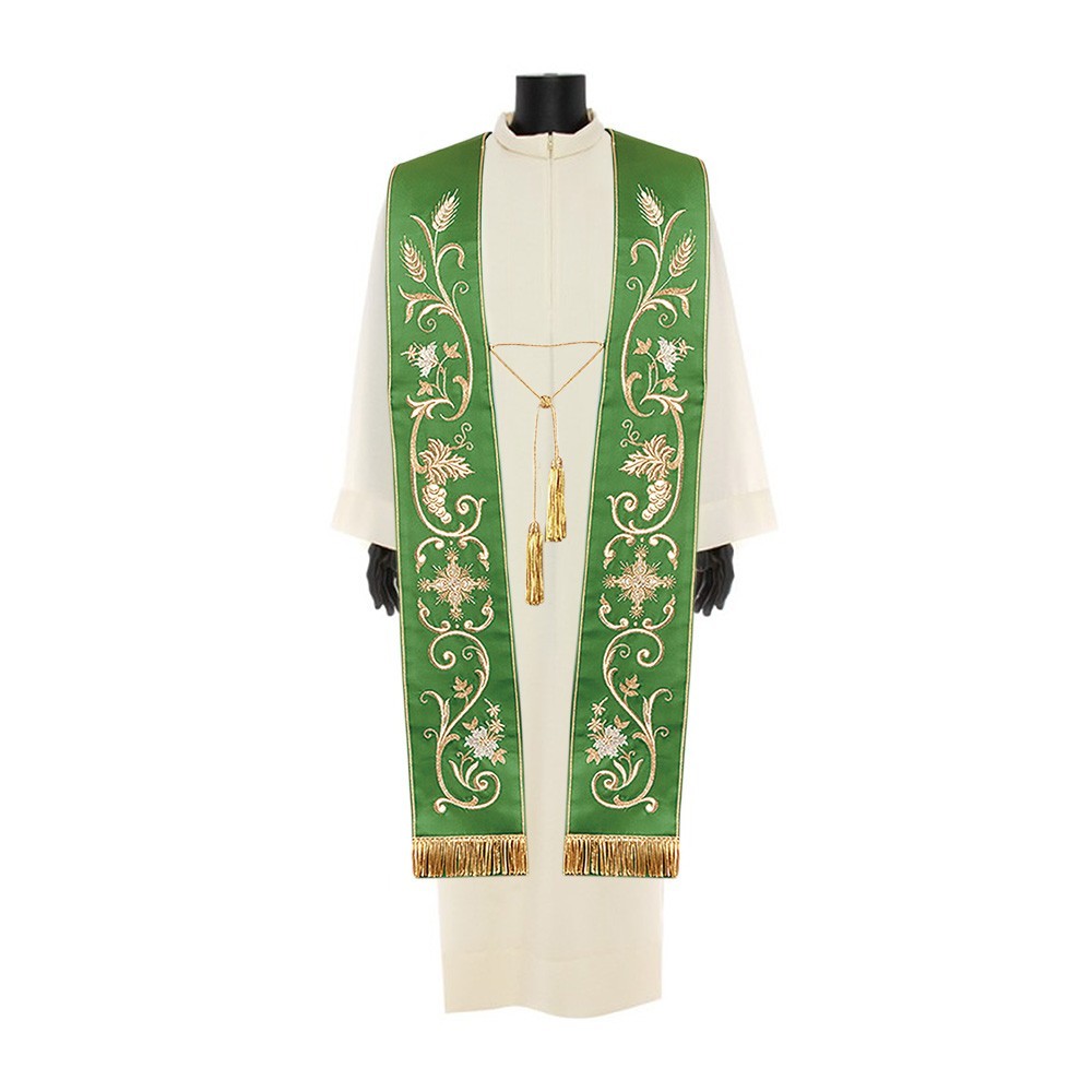 Stola liturgica in raso. Queto elegante paramento sacro è realizzato con un ricco ricamo su entrambi le brandelle, complete di frangia color oro sulle due estremità.