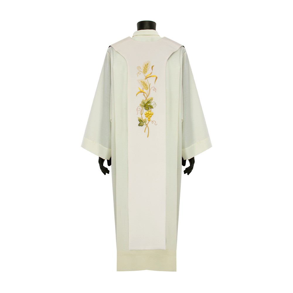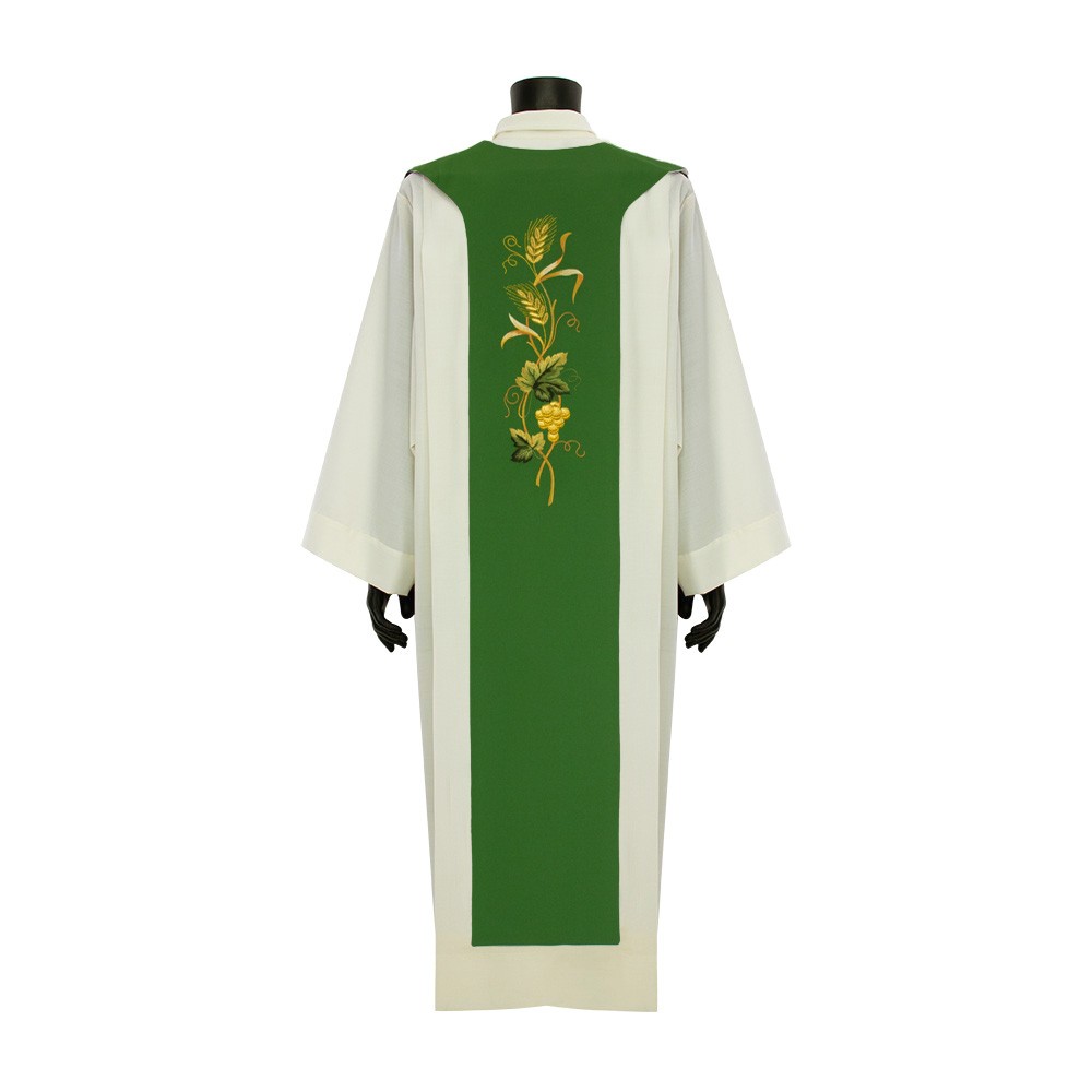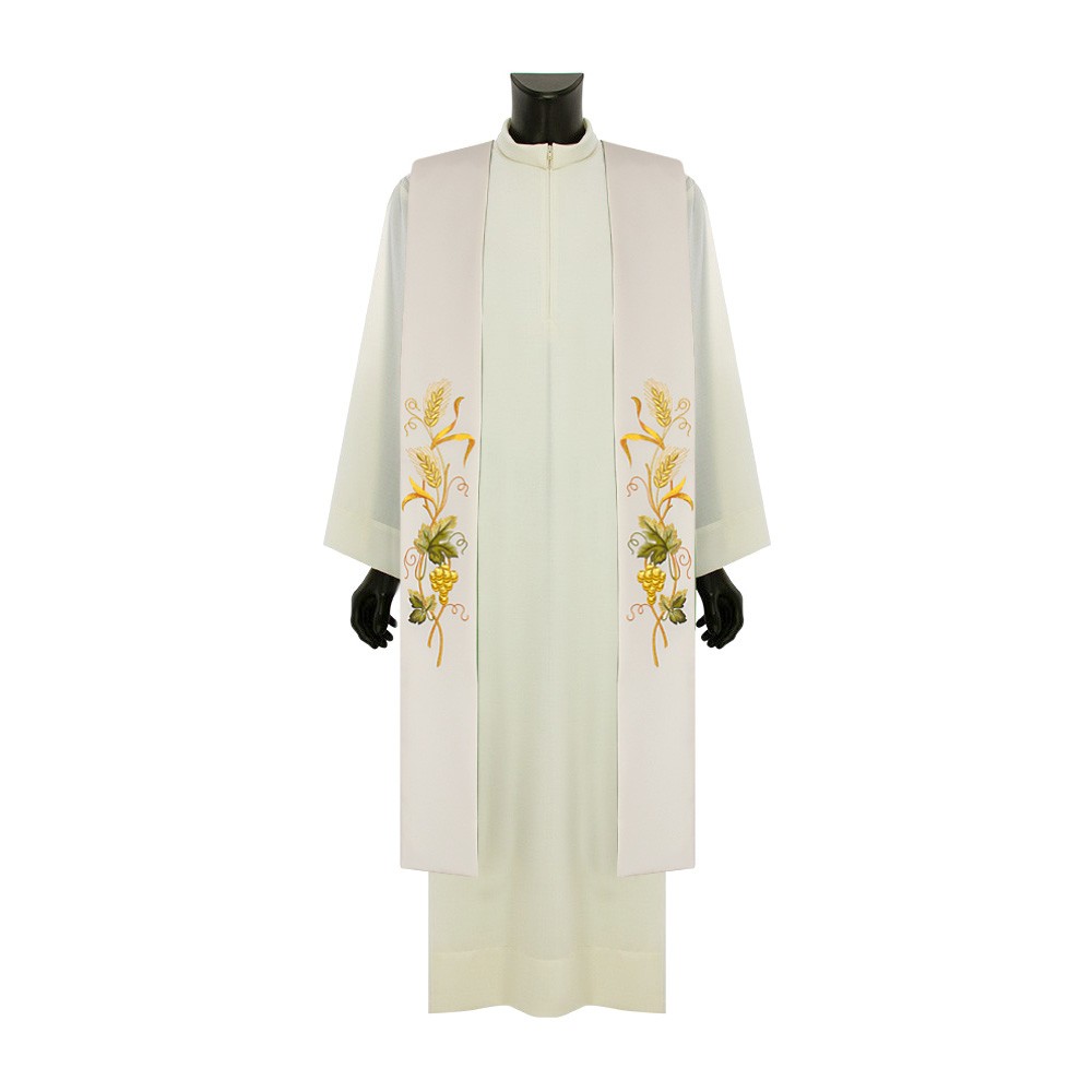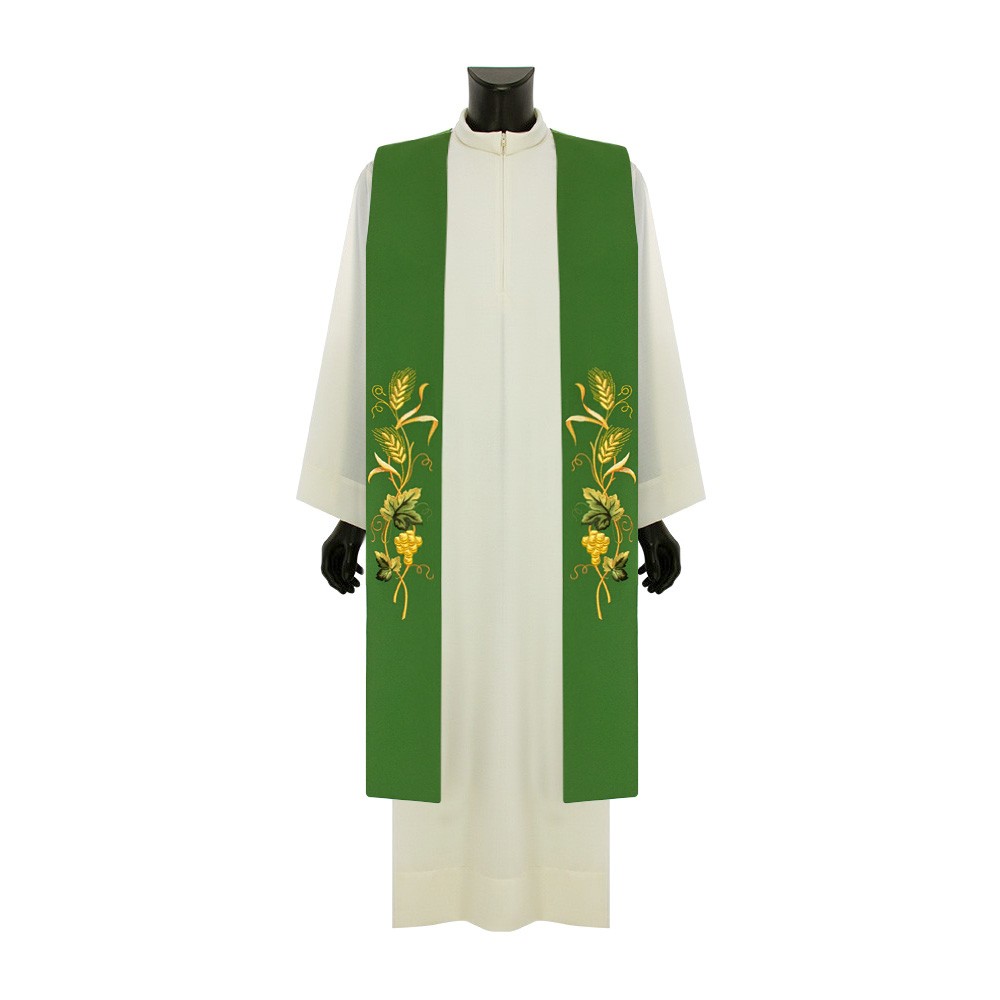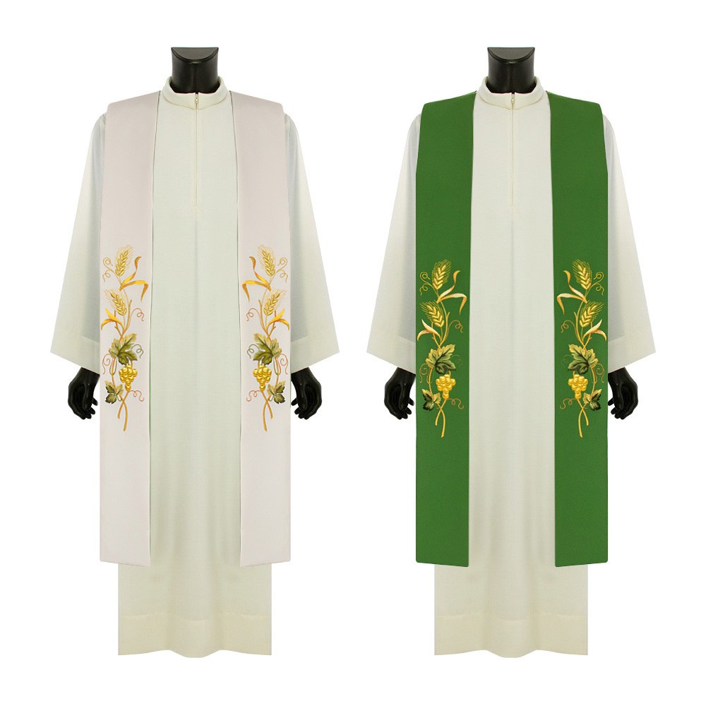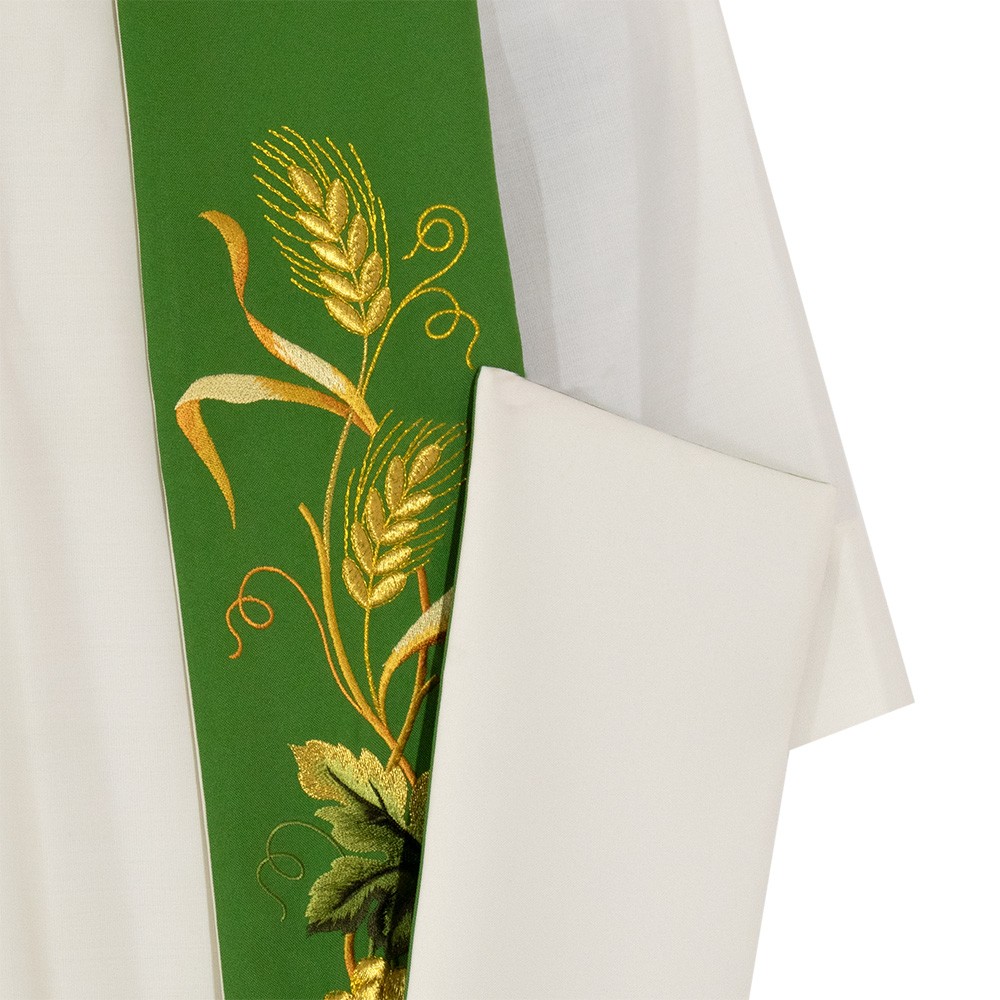 Questa tristola liturgica è confezionata in fresco e morbido tessuto poliestere, può essere indossata da entrambi i lati (avorio e verde).