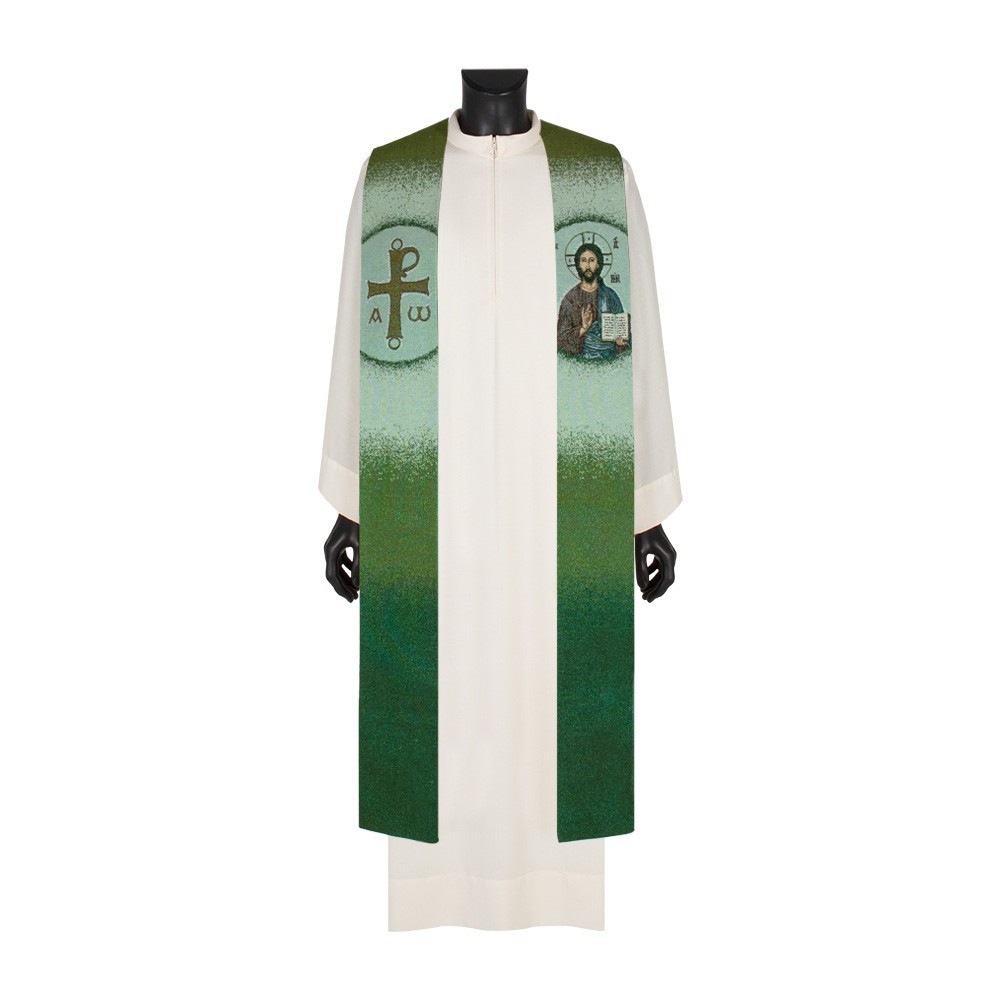 Stola sacerdotale finemente ricamata, raffigura da un lato l'immagine del Cristo Pantocratore e dall'altro lato una croce con i simboli alfa e omega.