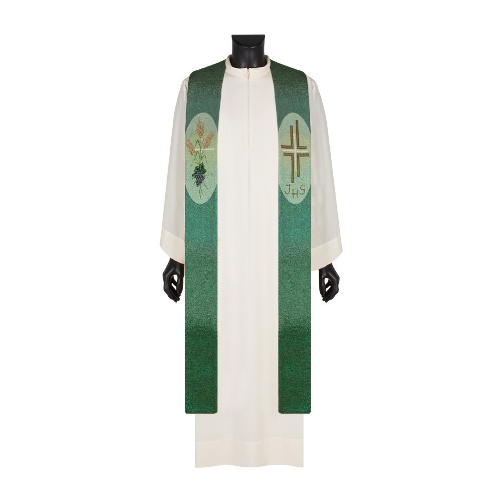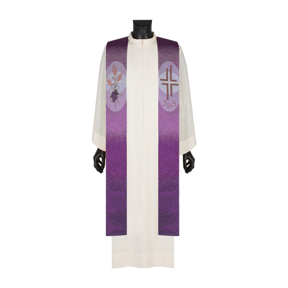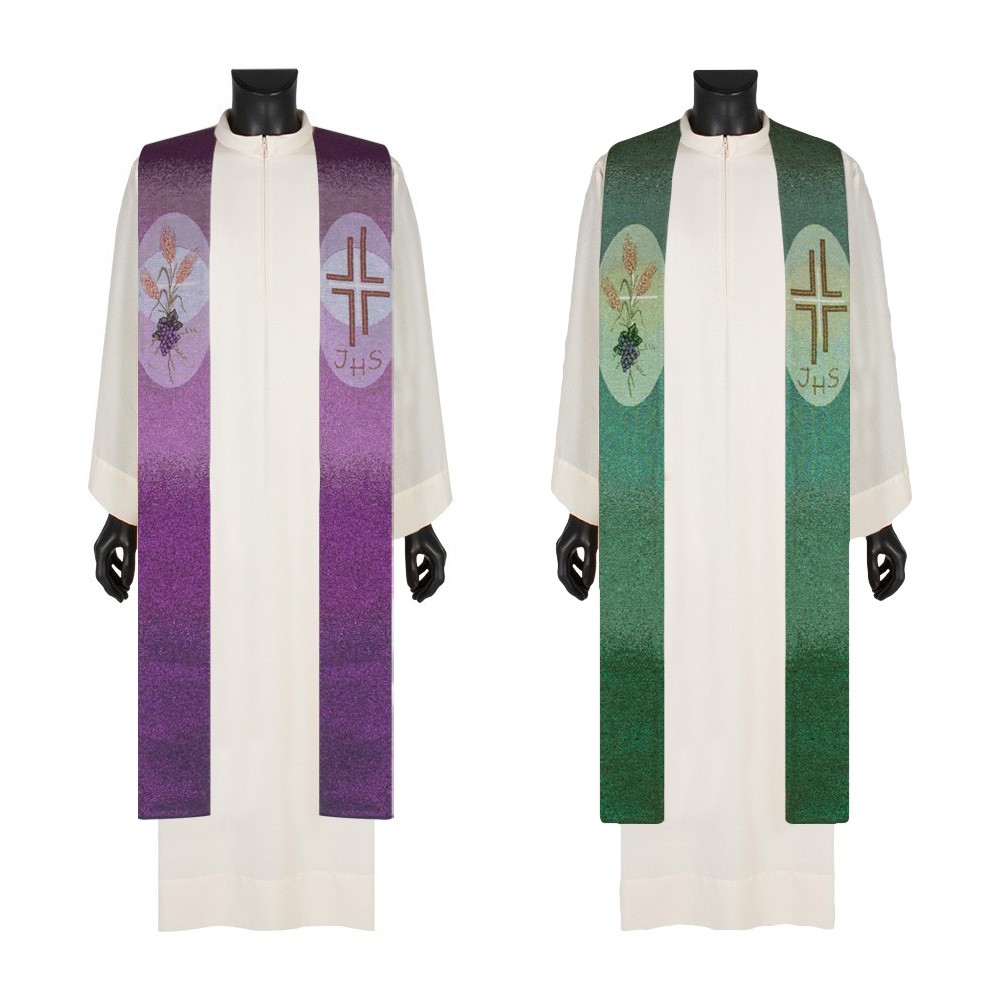 Stola sacerdotale bicolore viola e verde con simboli eucaristici ricamati.
