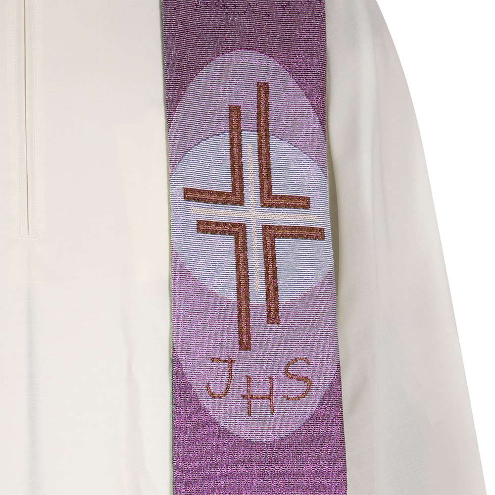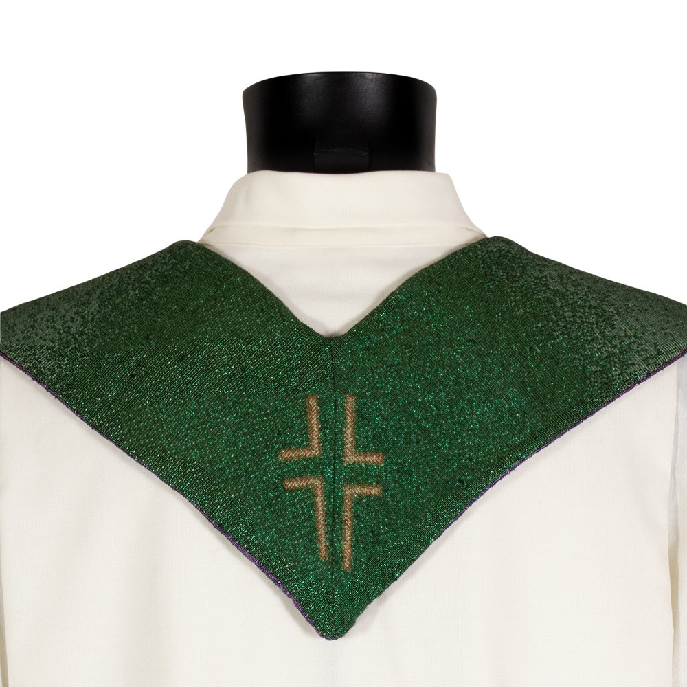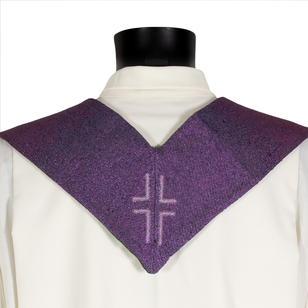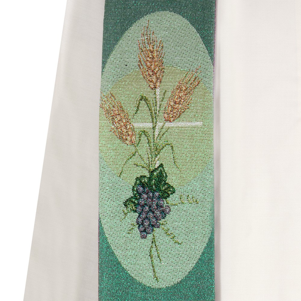 Stola sacerdotale bicolore viola e verde con simboli eucaristici ricamati.