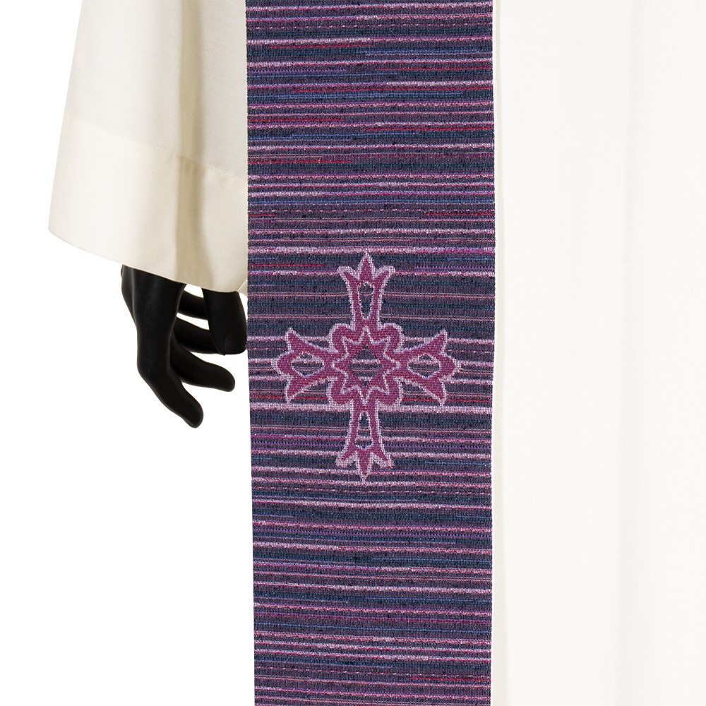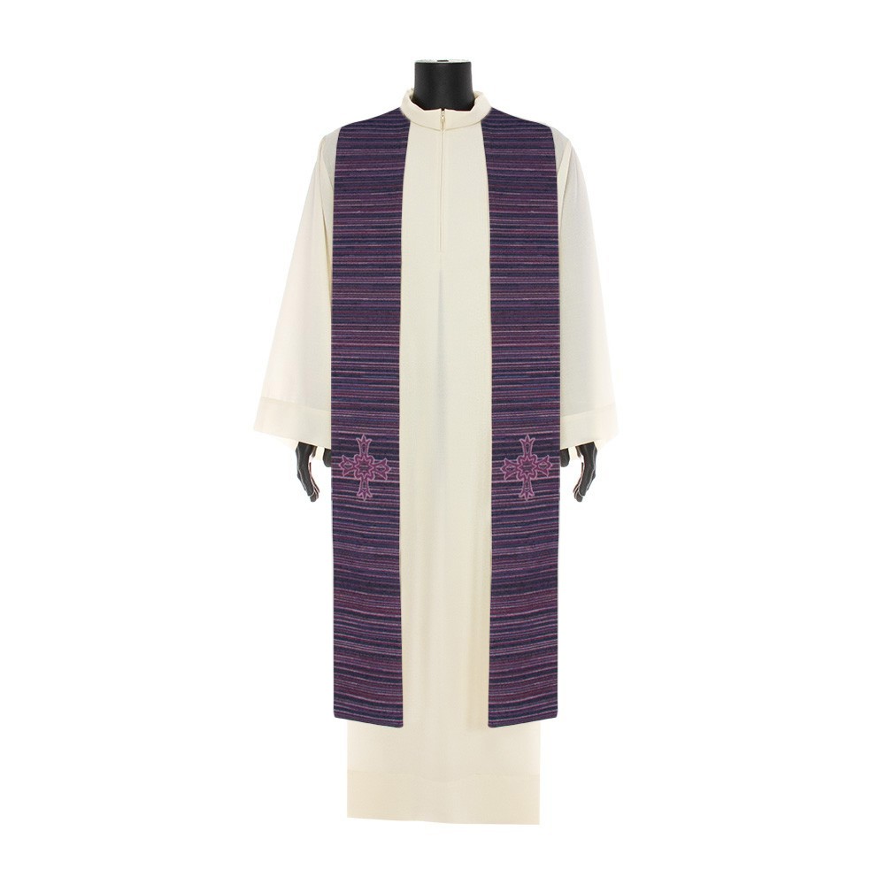 Stola sacerdotale viola con lavorazione in lamè rigata e croce ricamata tono su tono.