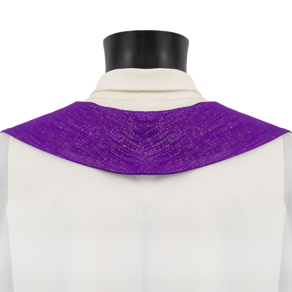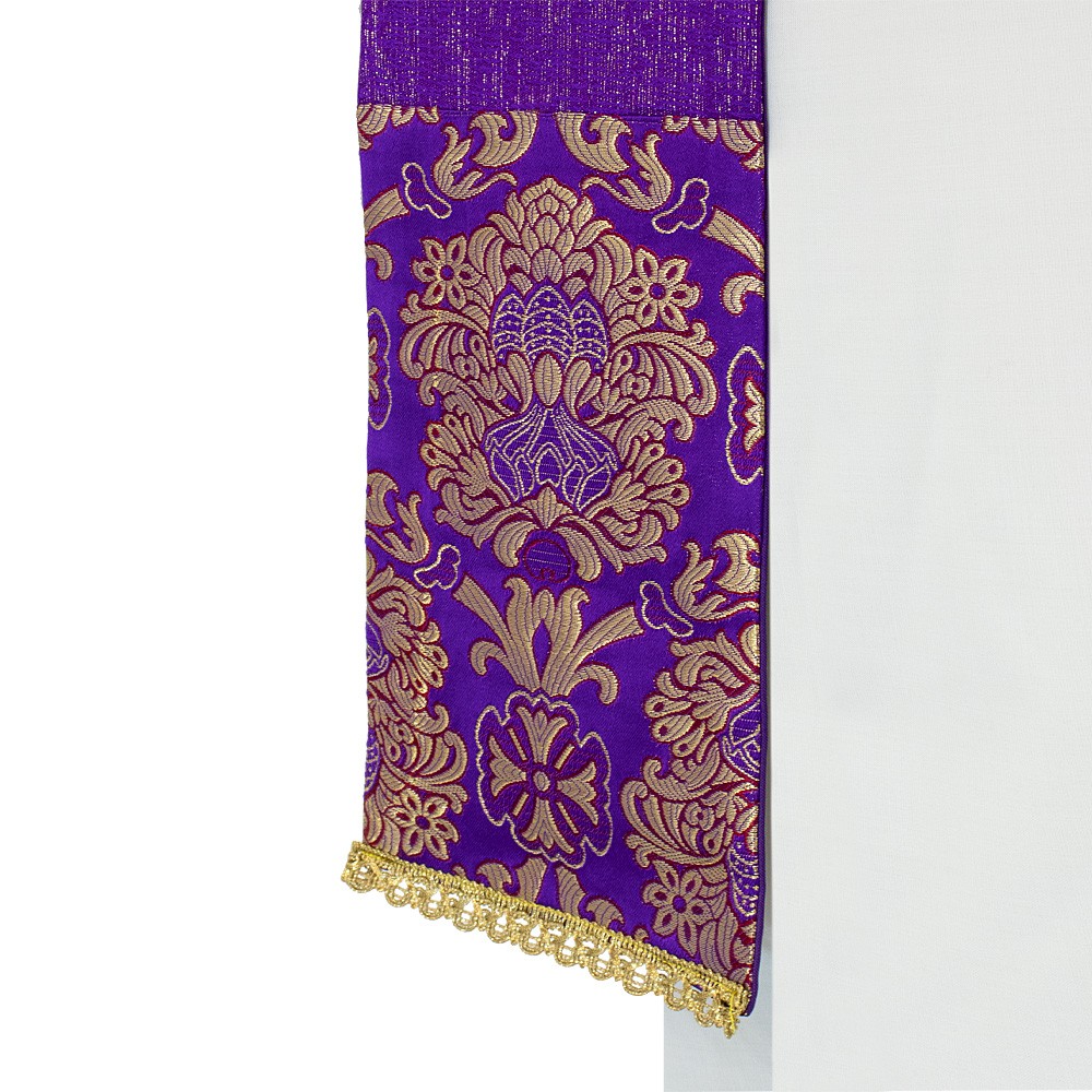 Stola da sacerdote viola con applicazione di agremano e tessuto broccato.