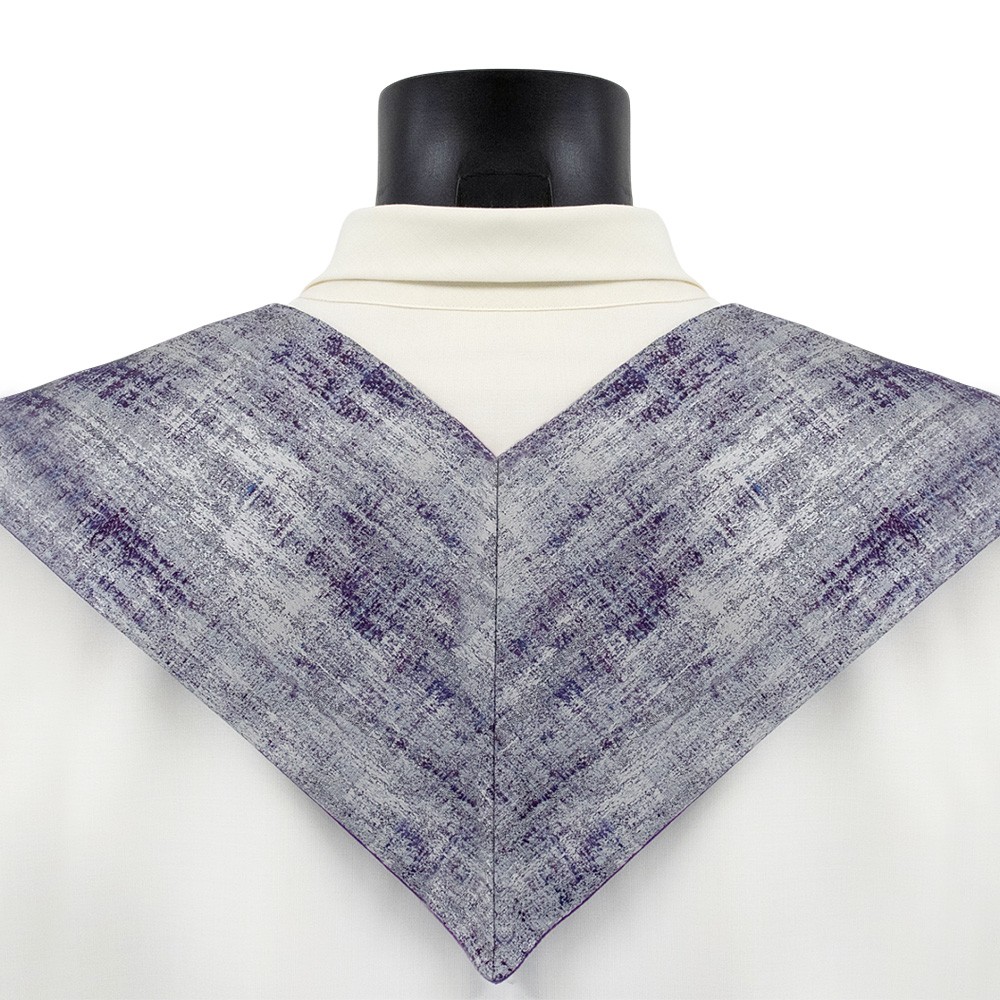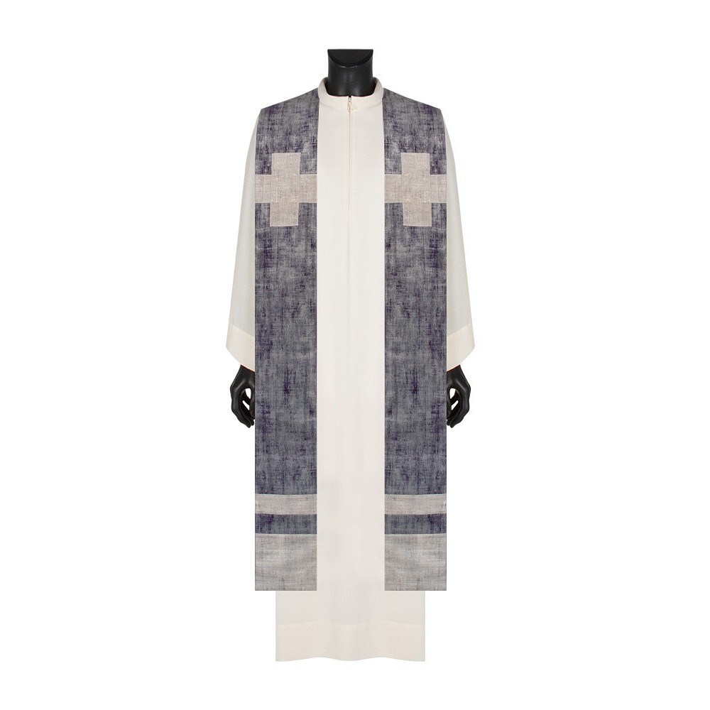 Questa stola liturgica di colore viola è realizzata in un pregiato tessuto misto di lino e seta, offrendo un prodotto leggero e traspirante, perfetto per ogni celebrazione liturgica, anche durante la stagione estiva.