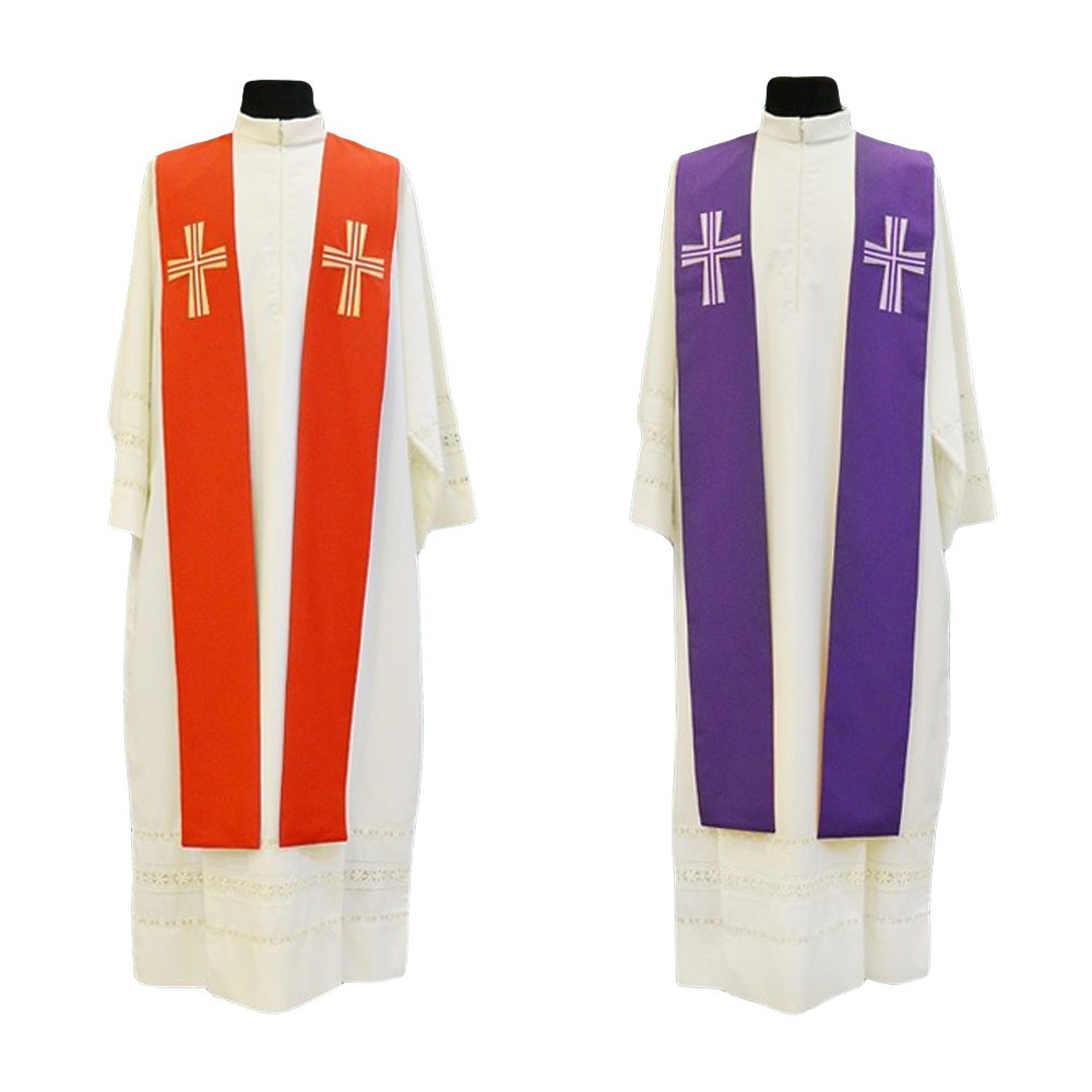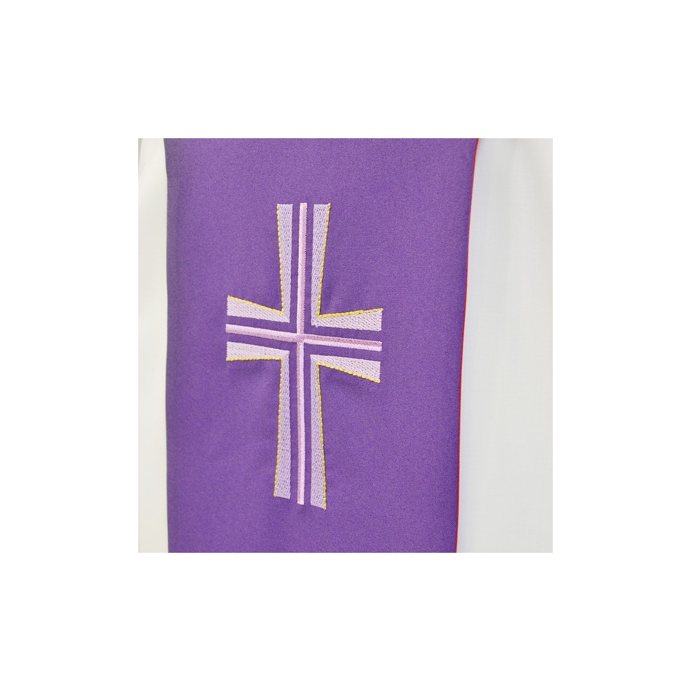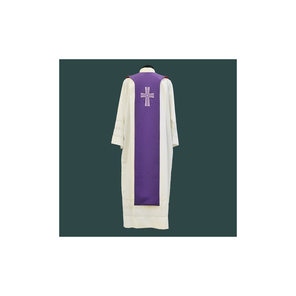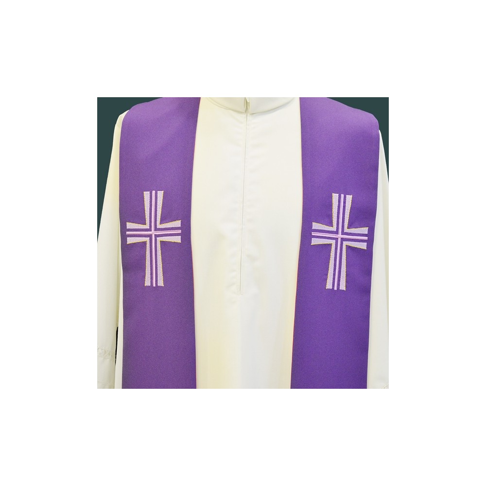 Tristola per sacerdote bicolore viola e rosso per sacerdote. Realizzata in poliestere, con croce dorata sul fronte e sul retro. Può essere usata sia dal lato viola che dal lato rosso, a seconda dell'occasione. Made in Italy.