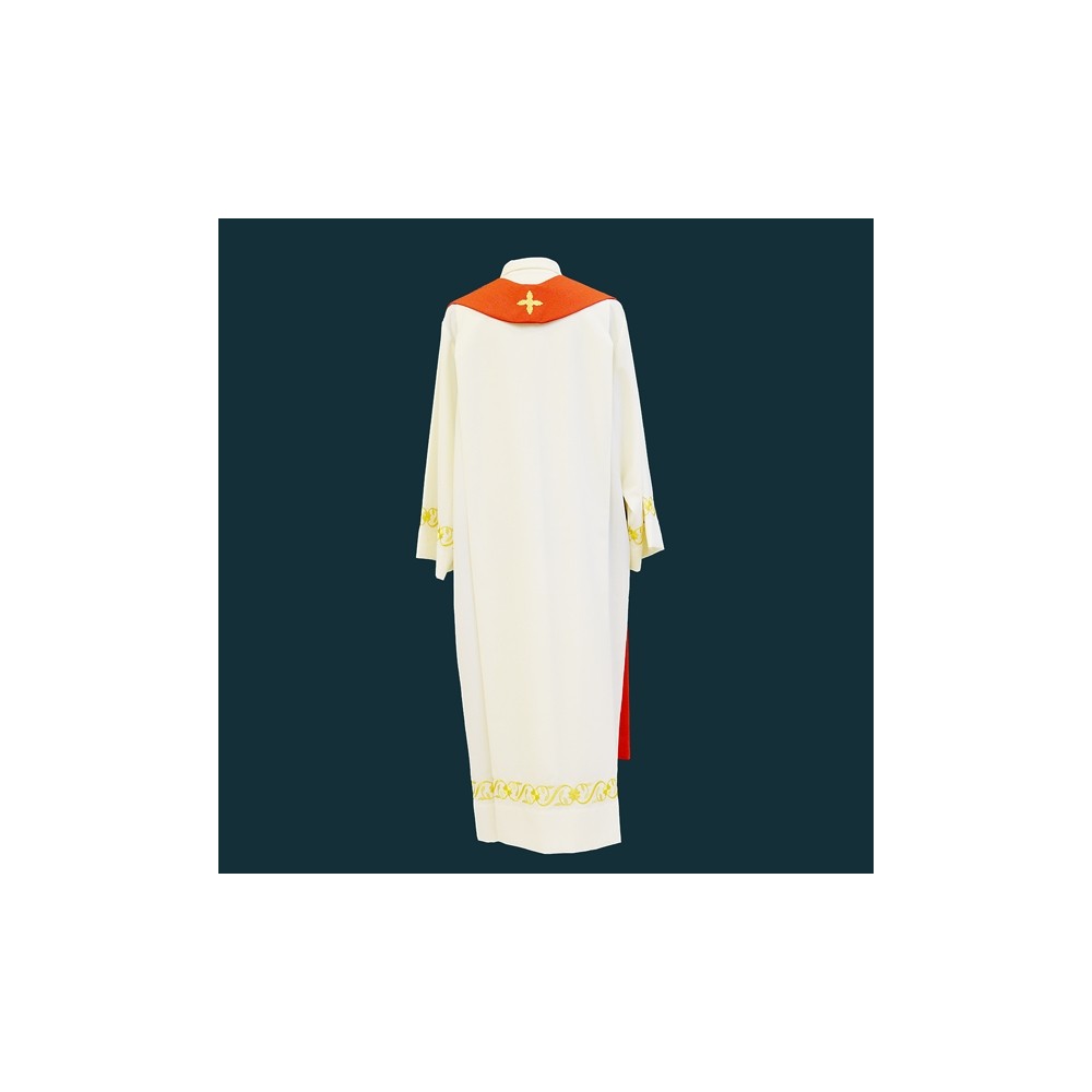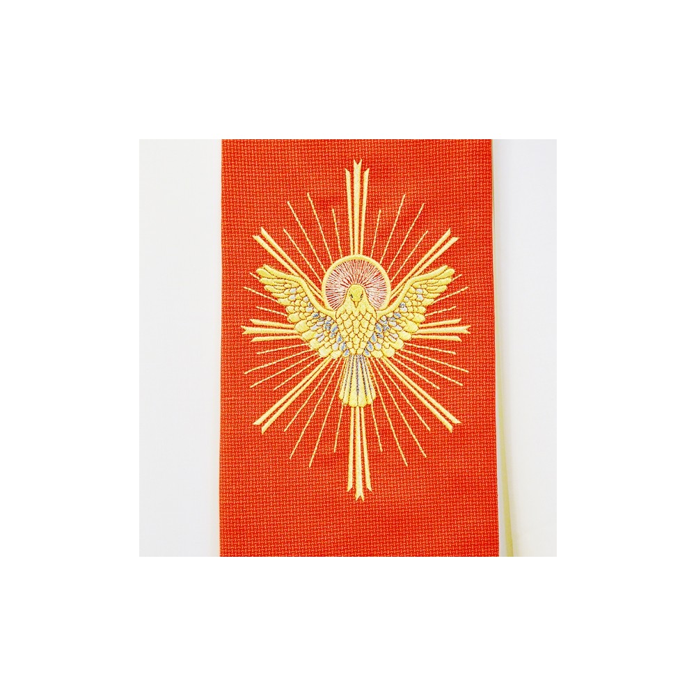 Elegante stola per sacerdote realizzata in misto lana. Stola con decori dorati sul fronte che rappresentano la Colomba (Spirito Santo) e 7 fiamme. I ricami vengono utilizzati con macchine di altissima qualità. Made in Italy.