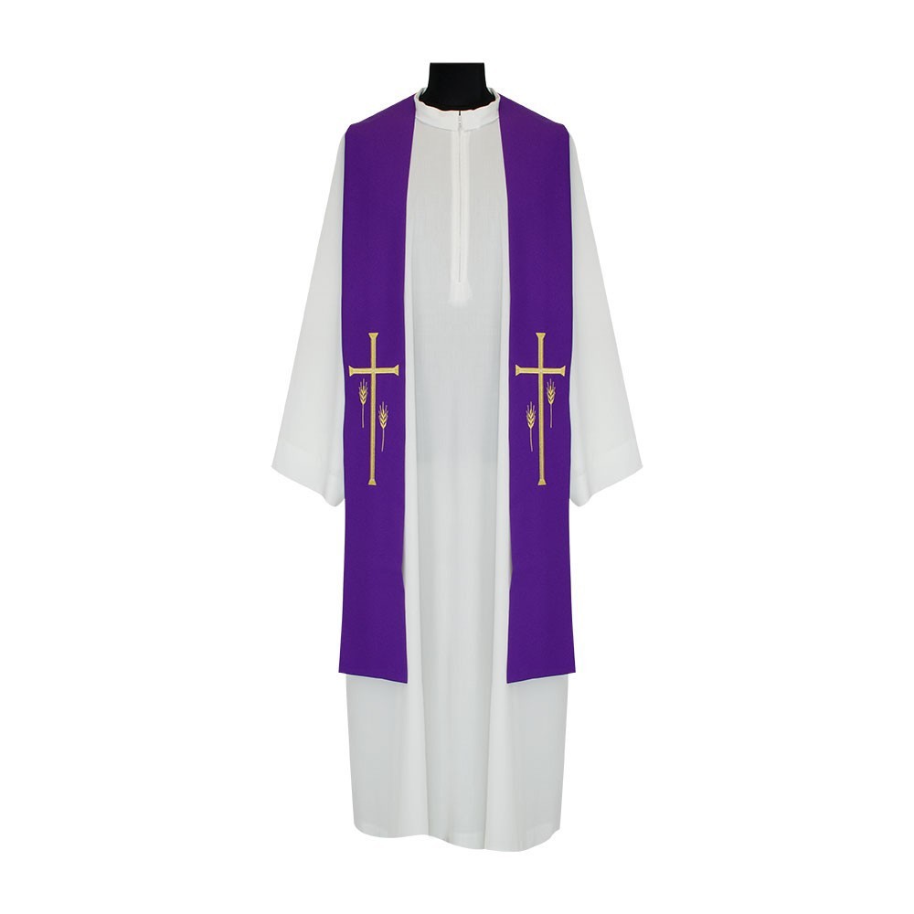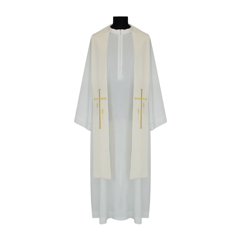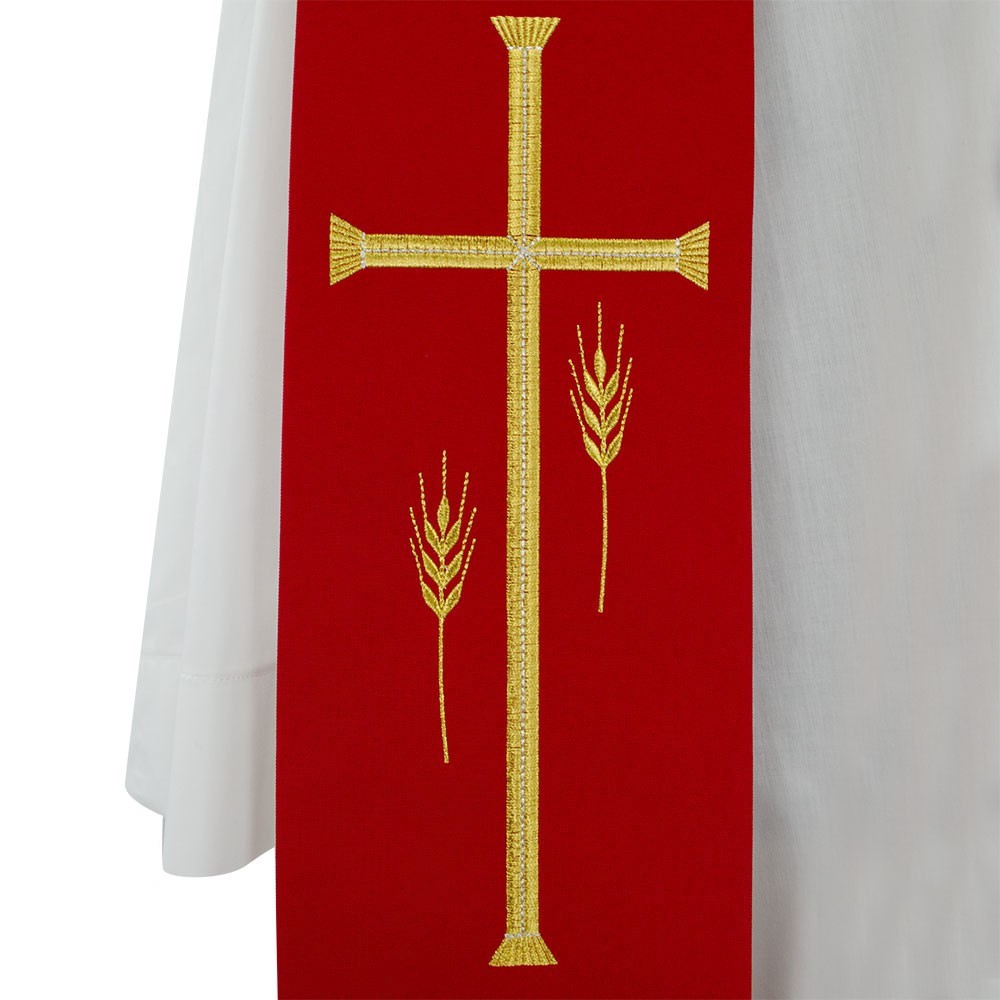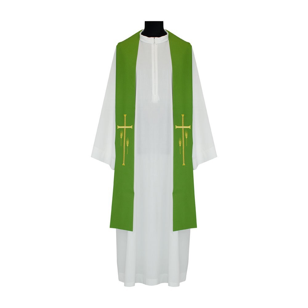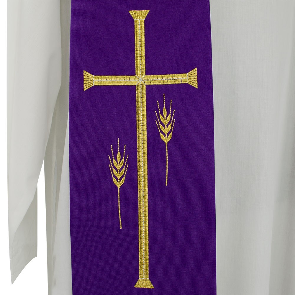 Stola in tessuto poliestere, con decorazioni sul fronte che rappresentano una croce e due piccole spighe. Eseguito da macchine di alta qualità. Disponibile nei colori liturgici.