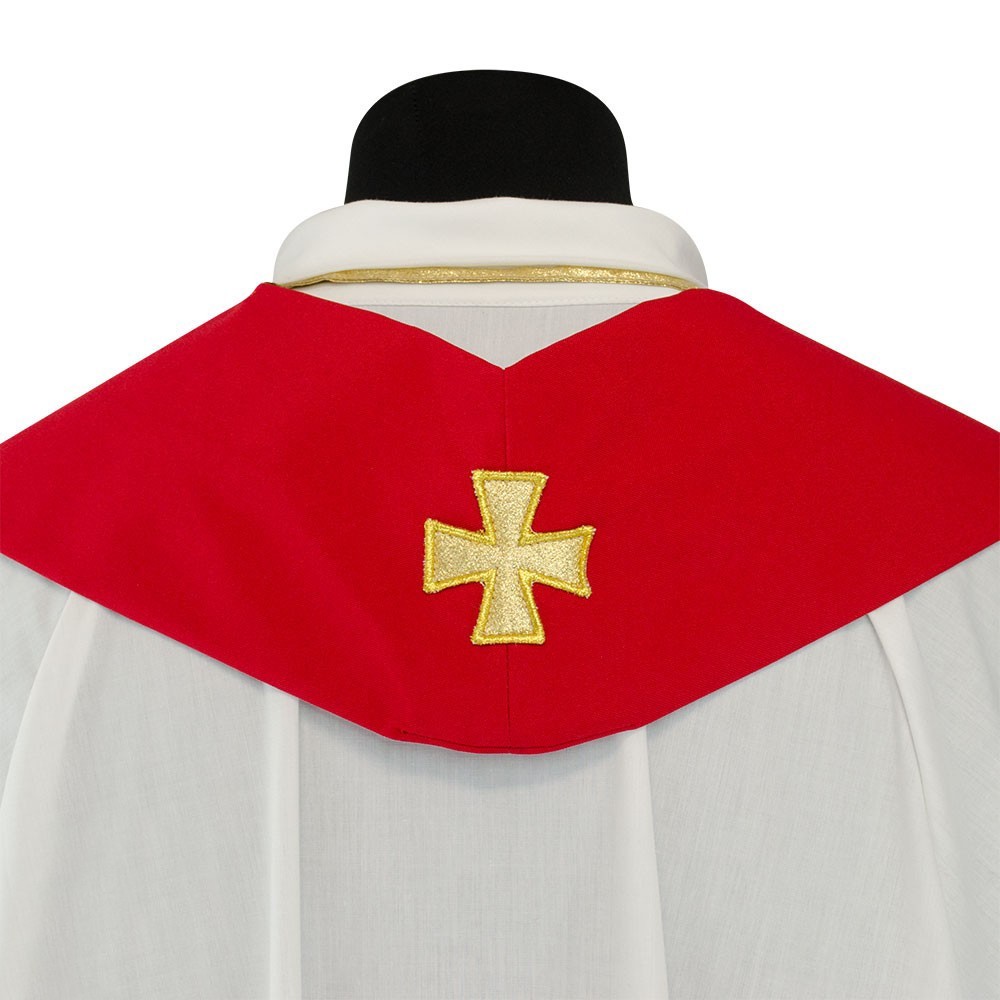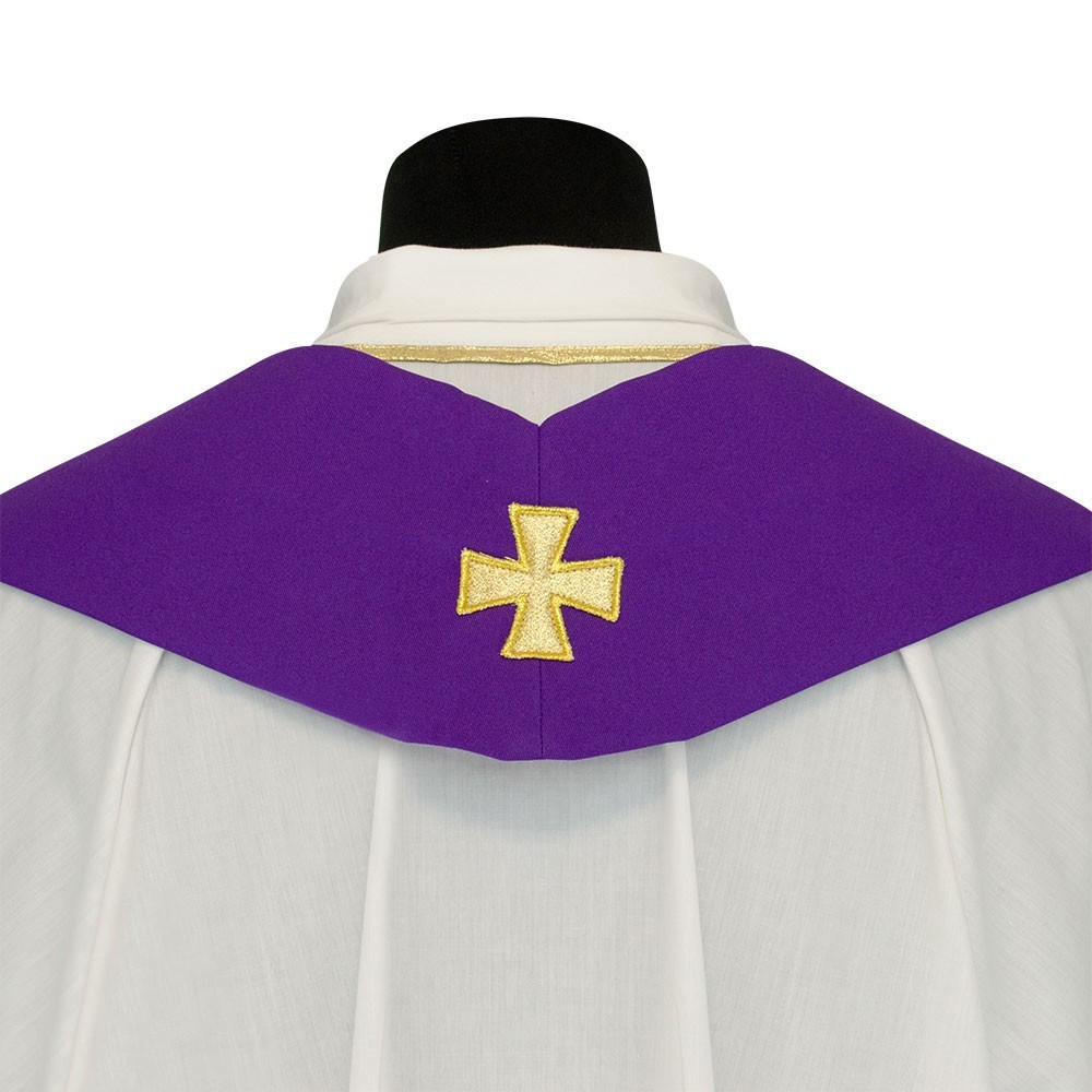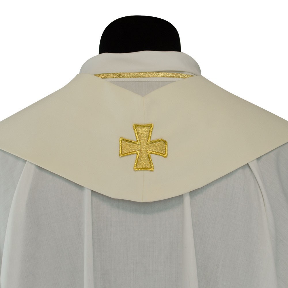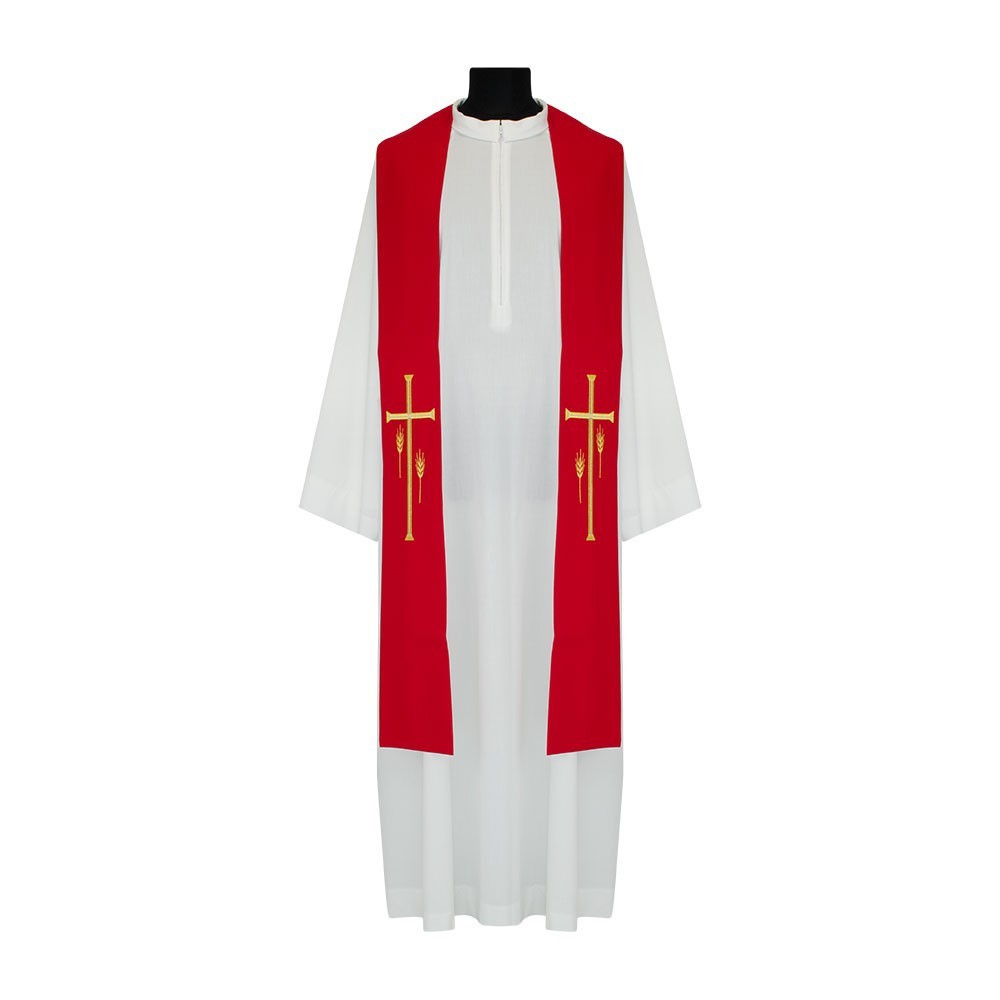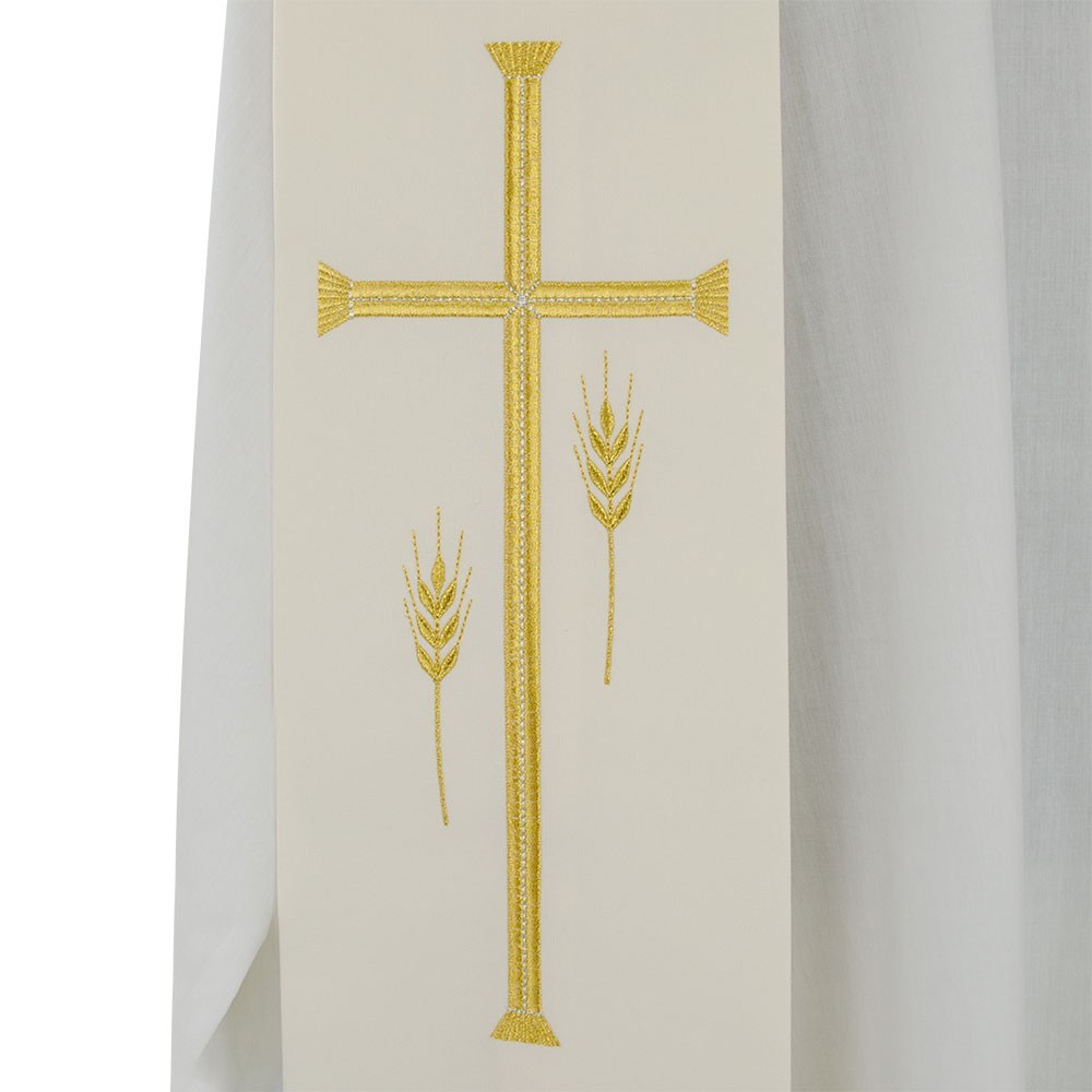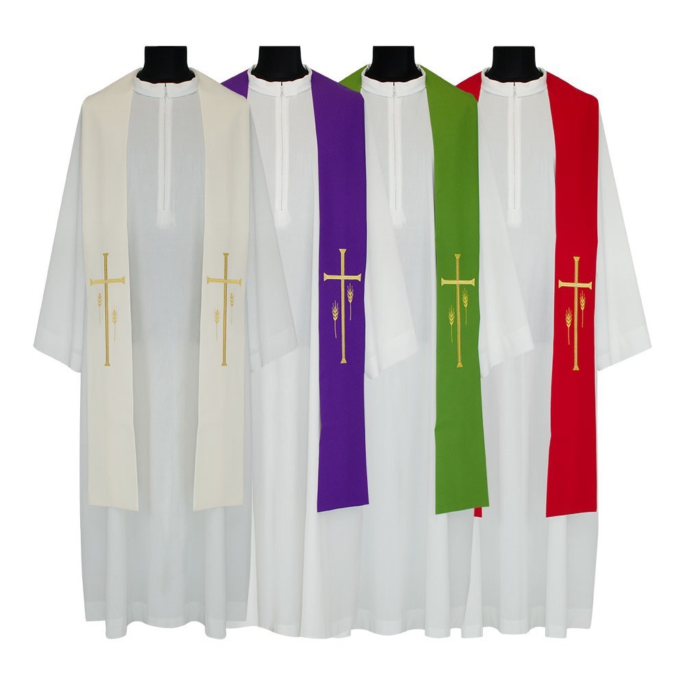 Stola in tessuto poliestere, con decorazioni sul fronte che rappresentano una croce e due piccole spighe. Eseguito da macchine di alta qualità. Disponibile nei colori liturgici.