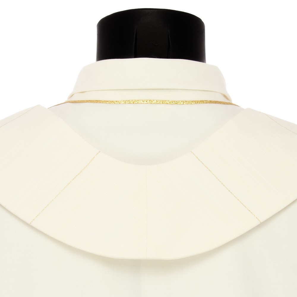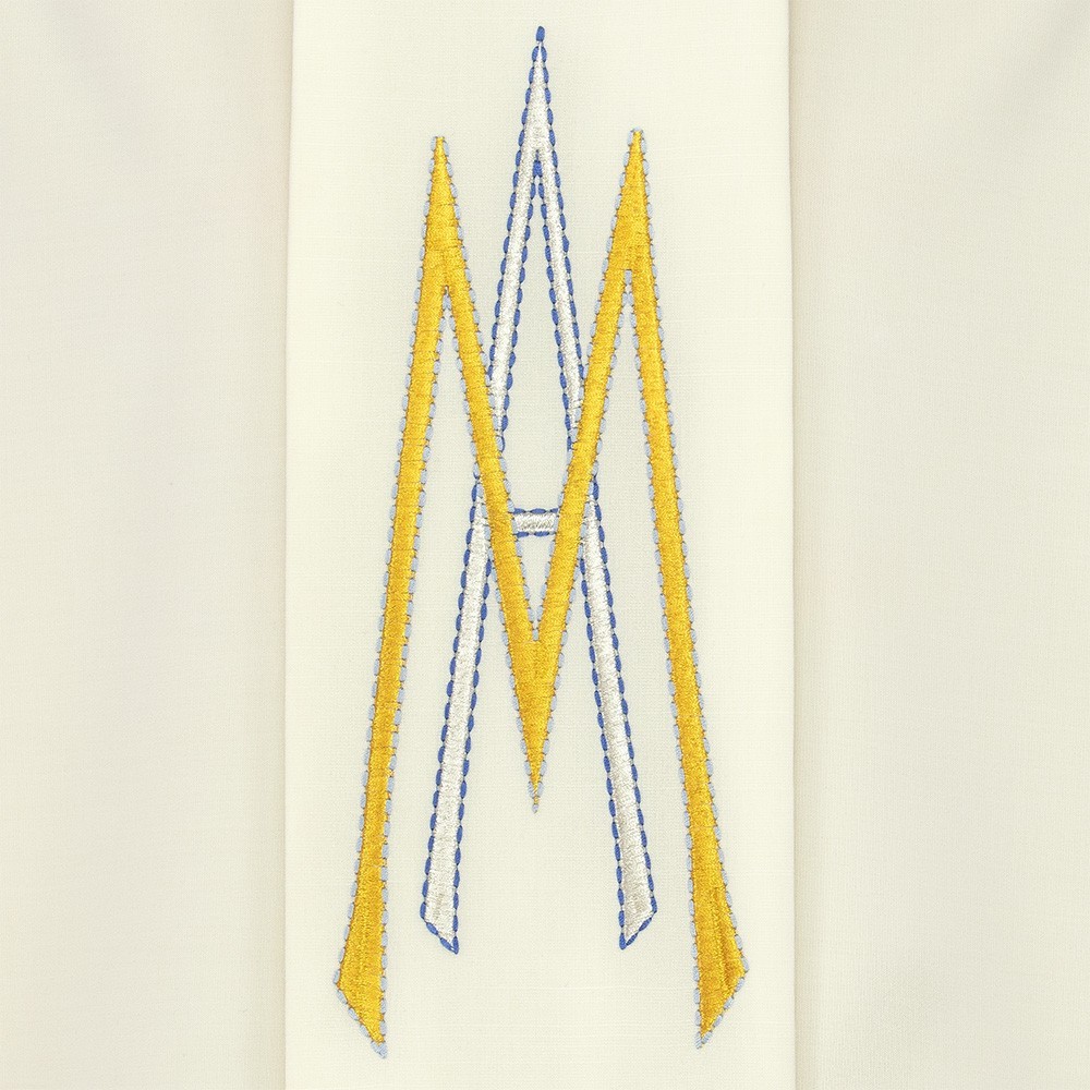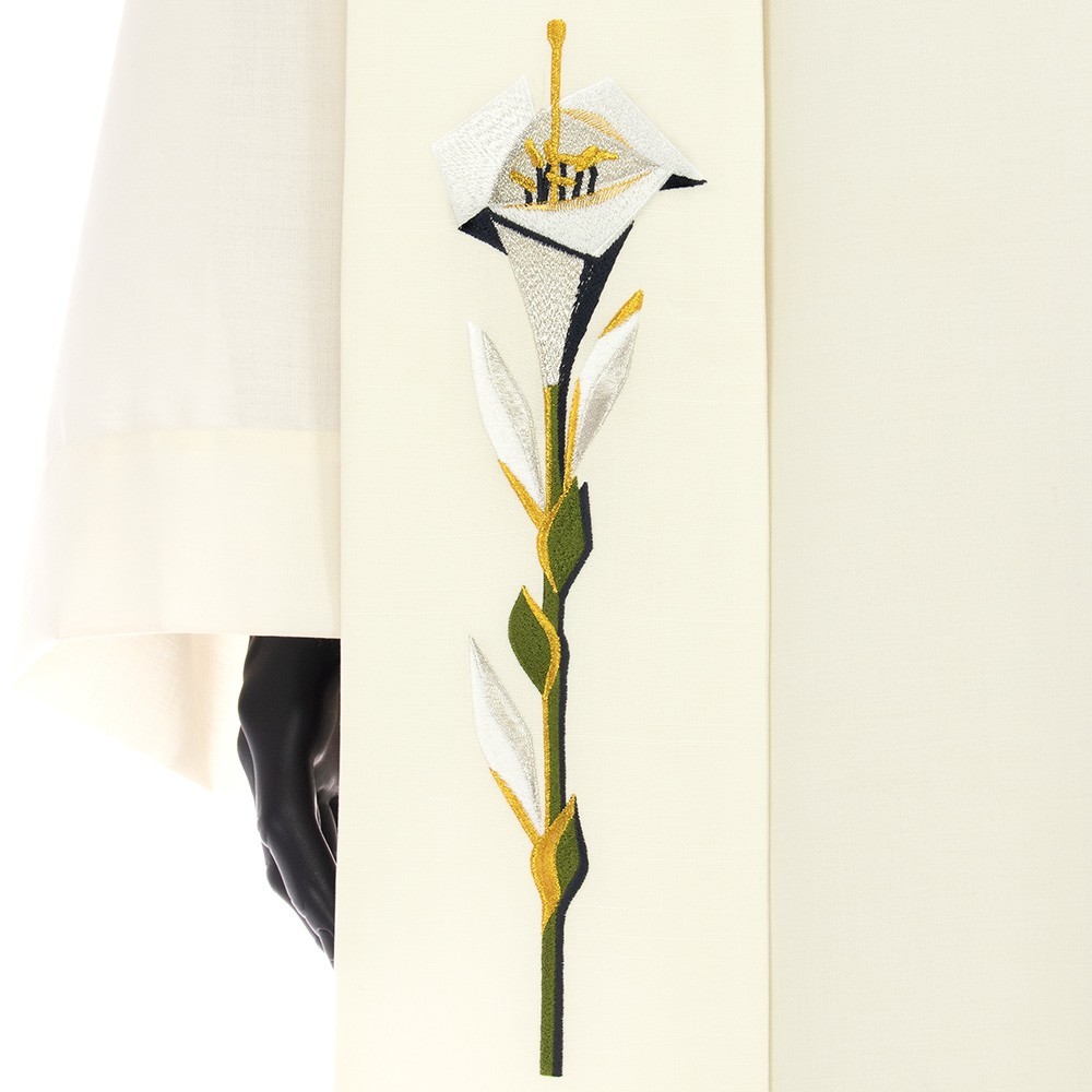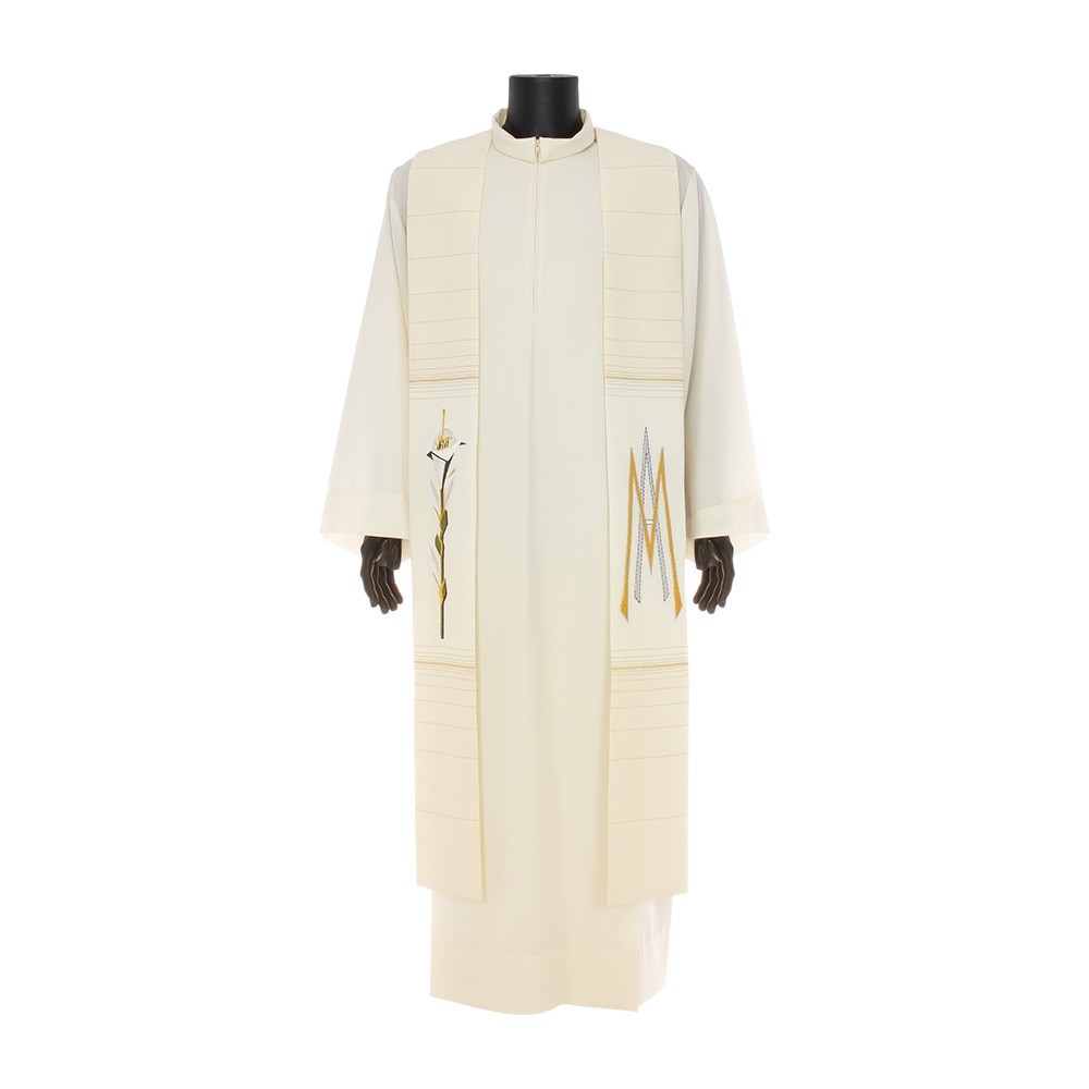 Stola con ricamo Mariano e giglio, realizzata in pregiato tessuto lana e seta. Il ricamo stilizzato è eseguito a macchina con cura e precisione, con filati in seta oro e seta colorata. Made in Italy.