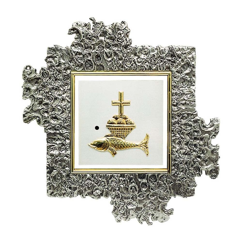 Tabernacolo da incasso a muro realizzato in ottone. La porticina misura 20x20 cm ed è ornata con i simboli del pesce e del cesto di pane. Intorno alla porta vi sono decorazioni argentate. La porta è fornita di serratura di sicurezza.
