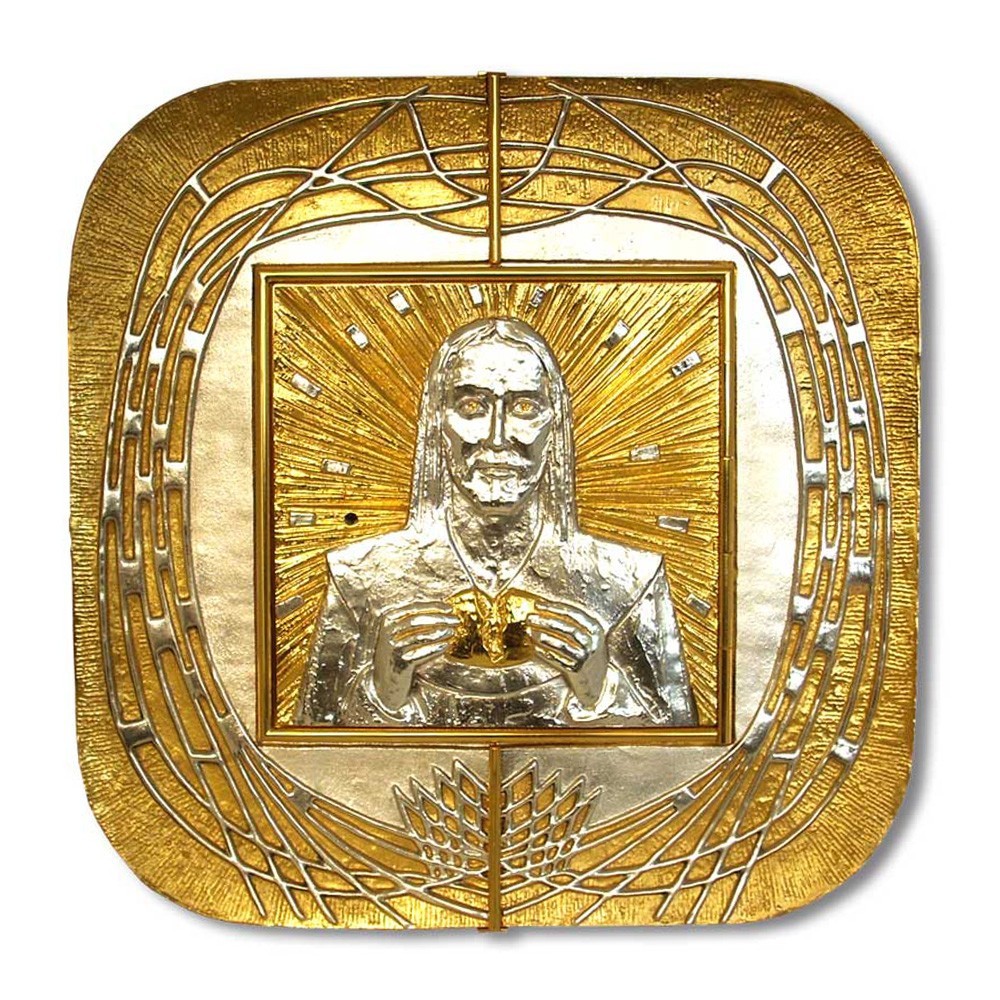 Sulla porta del tabernacolo è raffigurata il Volto di Gesù in argento su uno sfonto dorato.Anche la decorazione a raggiera intorno alla porta è di color argento. La porta misura 30x30 cm ed è dotata di serratura di sicurezza. Questo arredo sacro è realizzato in ottone con finitura dorata e argentata.
