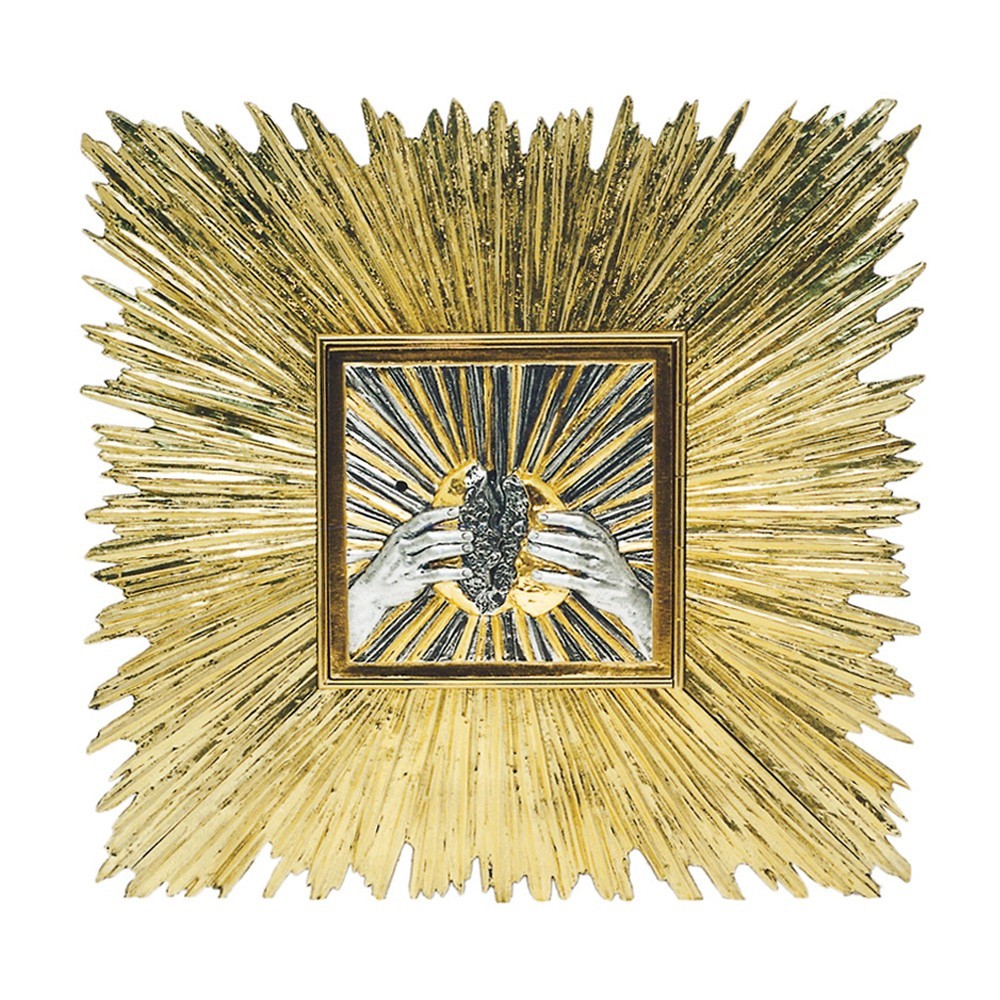 Questo tabernacolo da incasso è realizzato in ottone bicolore, presenta un ricco decoro raffigurante le mani che spezzano il pane. Intorno alla porta vi sono decorazioni a forma di raggiera, rendendo l'articolo elegante e luminoso. La porta dispone di serratura di sicurezza.