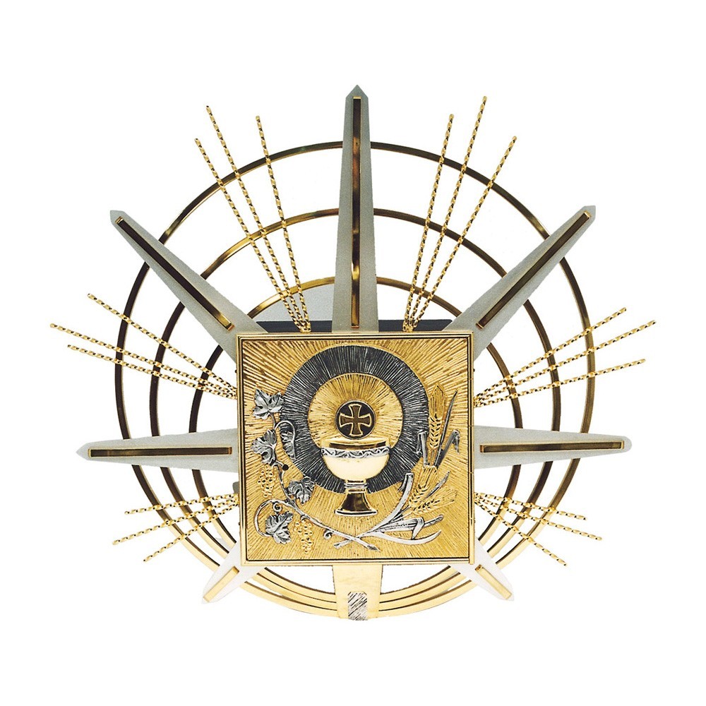 Questo tabernacolo da incasso è realizzato in ottone bicolore, presenta decorazioni di simboli eucaristici (calice e spighe di grano). Intorno alla porta vi sono decorazioni a forma di raggiera, rendendo l'articolo elegante e luminoso. La porta dispone di serratura di sicurezza.