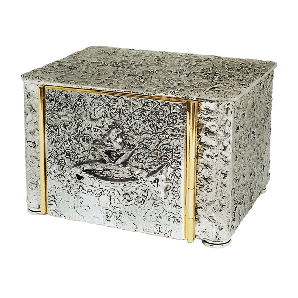 Questo tabernacolo da mensa è un arredo sacro realizzato in ottone. La porta è decorata raffigurante un cesto di pane stilizzato ed è fornita di una serratura di sicurezza.