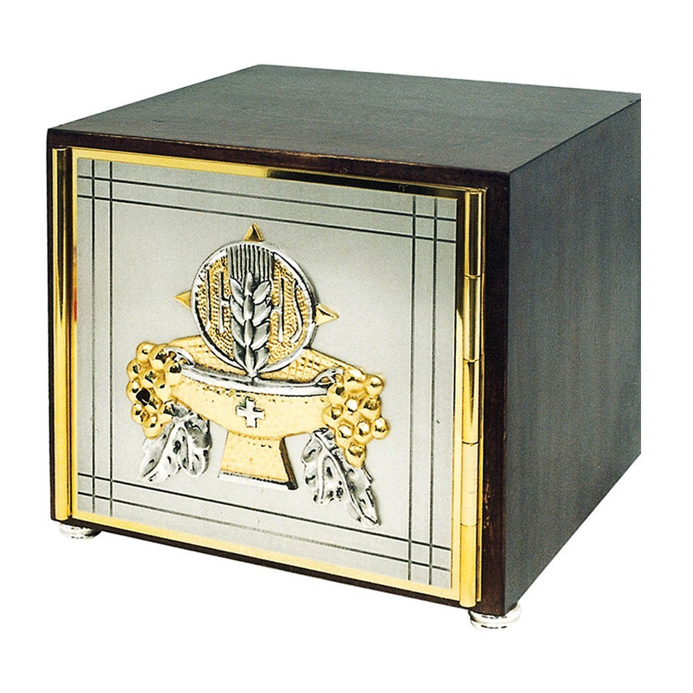 Tabernacolo in legno di faggio e porta in ottone. La porta è in ottone bicolore ed è ornata con simboli eucaristici (caice, uva e spighe di grano). Dispone di una serratura di sicurezza. E' un prodotto di ottima qualità, realizzatoe rifinito a mano da un'azienda italiana.
