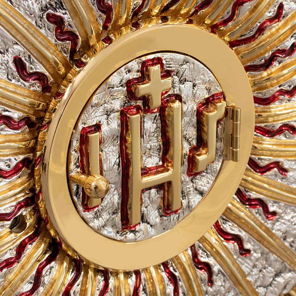 Il decoro posto sulla porta del tabernacolo raffigura il simbolo JHS, con smalto vetrato, circondato da raggi in ottone oro e argento.