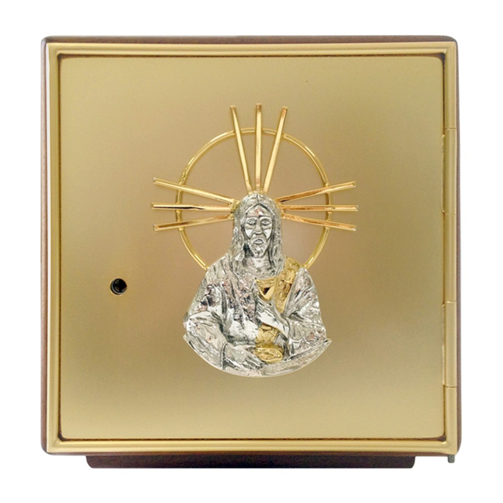 Tabernacolo da mensa in ottone e legno, con porta ornata raffigurante Gesù Cristo.