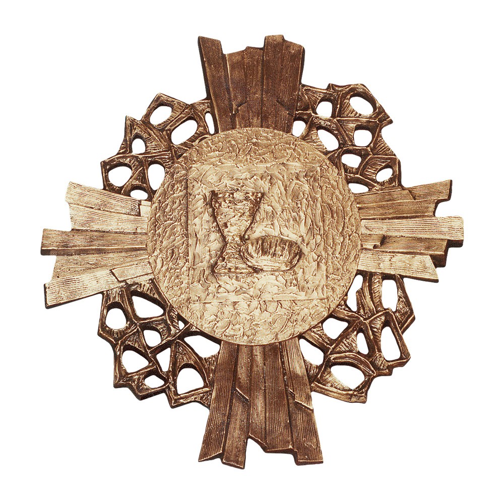 Il decoro posto sul tabernacolo raffigura il calice e il pane. il tabernacolo è in ottone fusione oro.