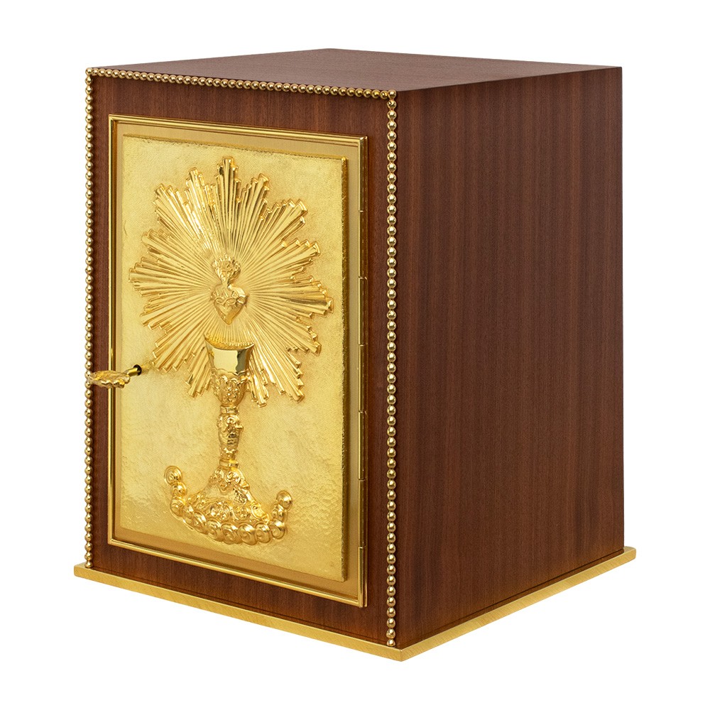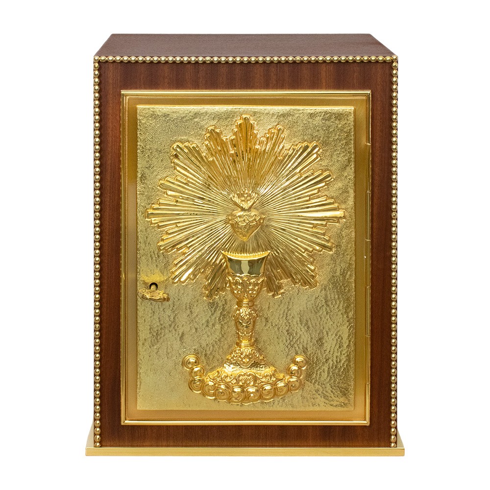 Sulla porta del tabernacolo è raffigurata e intagliata a mano i simboli calice e sacro cuore con raggiera. La porticina è fornita di due chiavi con serratura di sicurezza. Il tabernacolo è realizzato rigorosamente in legno e ottone dorato. L'interno del tabernacolo e la base sono in ottone dorato, mentre l'esterno è in legno color noce scuro.