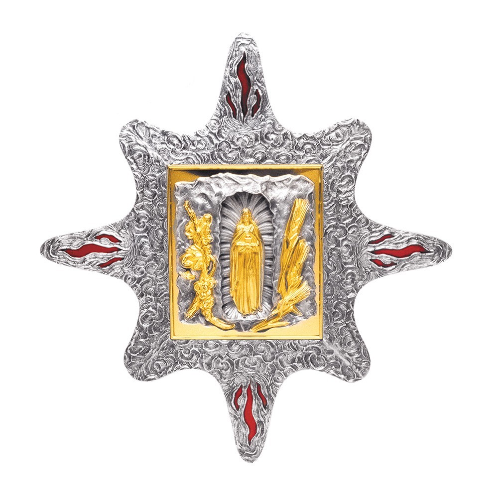 Tabernacolo a muro in ottone a forma di stella a 8 punte, decorata con fiamme e porticna con Sacro Cuore di Gesù.