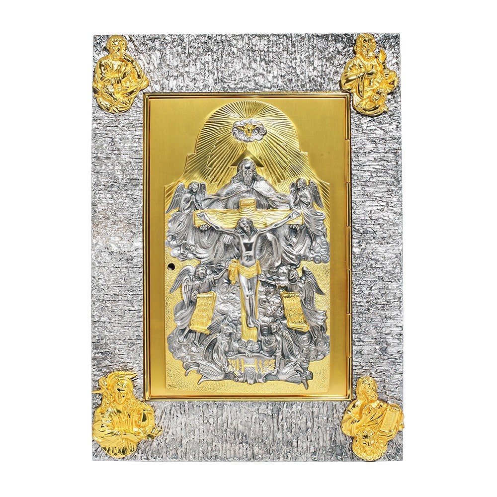 Sulla porta del tabernacolo è raffigurata la scena della Crocifissione di Cristo. Questo arredo sacro è realizzato in ottone con finitura dorata e argentata. Completo di serratura di sicurezza con tre chiavi incluse. La cassa è in ferro.