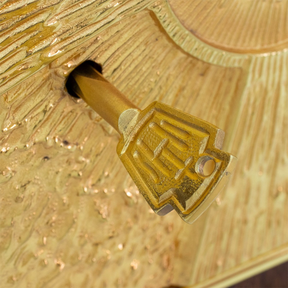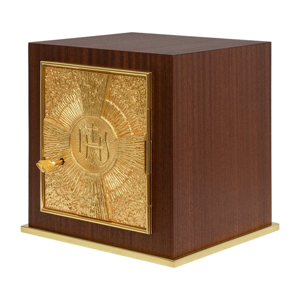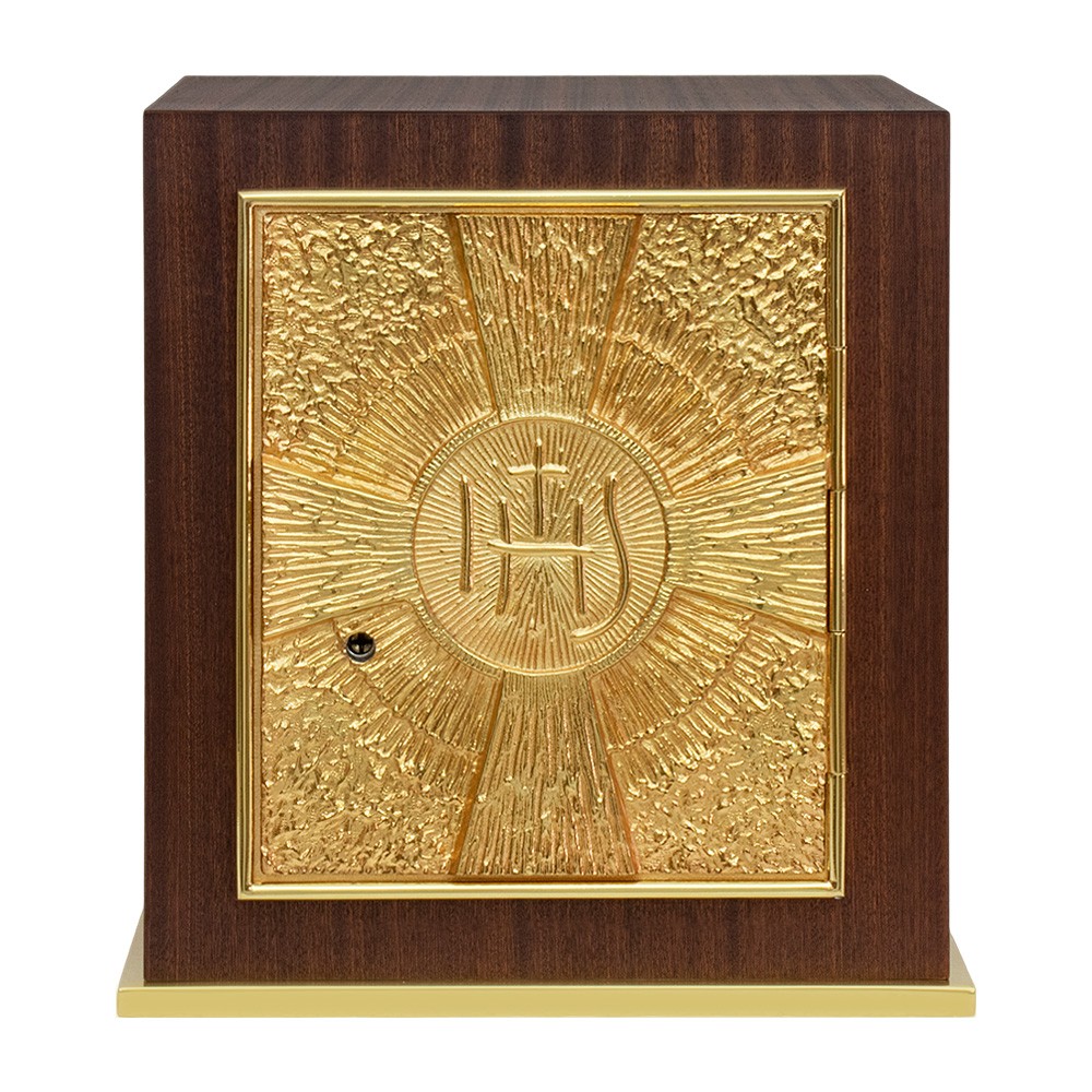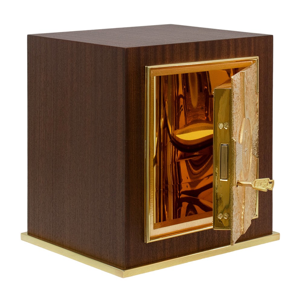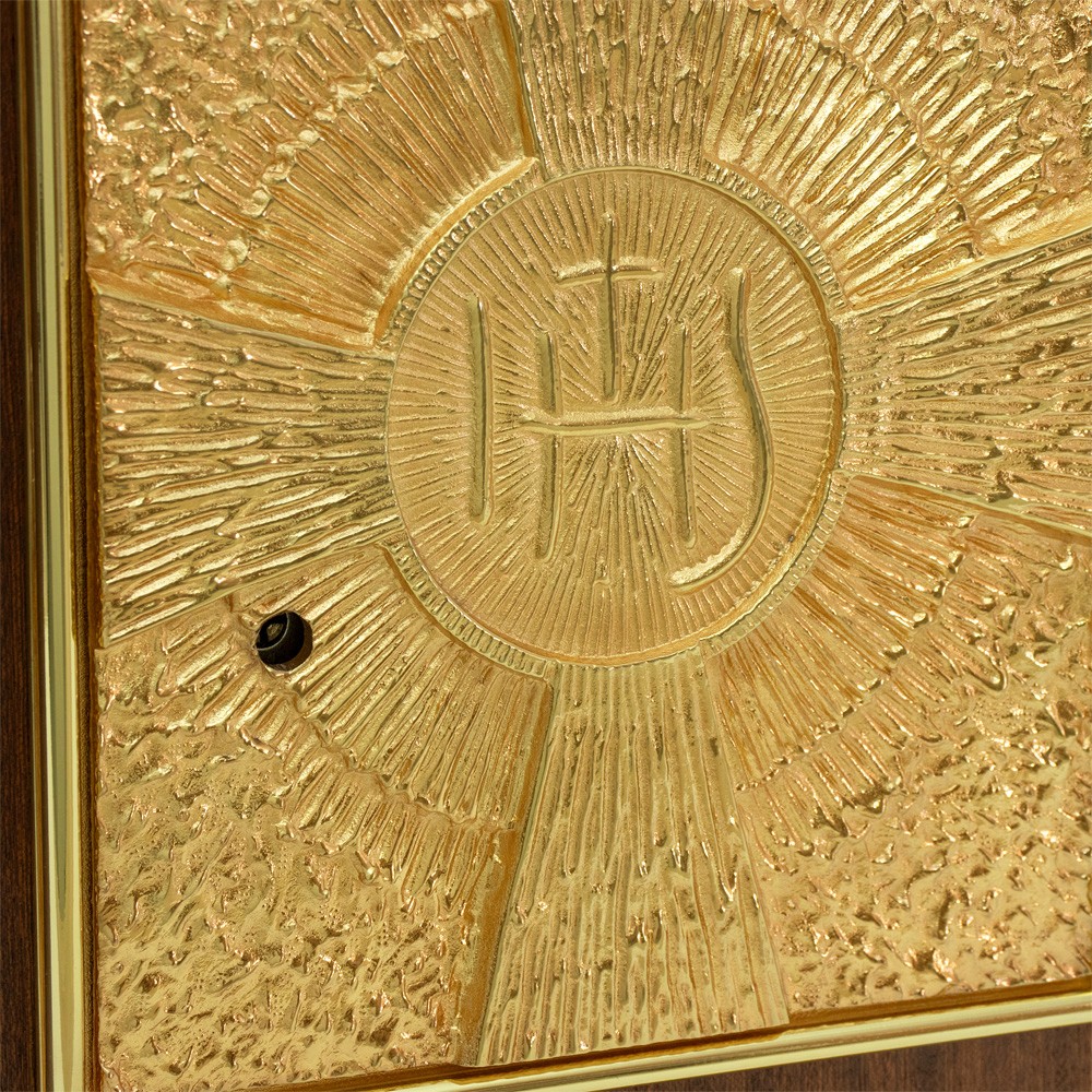 La base e la porta sono interamente in ottone dorato. Sulla porta del tabernacolo è raffigurata una croce con al centro la scritta JHS. Le pareti interne sono in lastre di ottone dorato. Fornito di serratura di sicurezza con tre chiavi incluse.