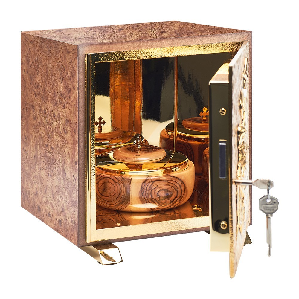 L'esterno del tabernacolo è in robustissimo legno tamburrato da 2 cm con finitura radica di olmo, mentre la porta è in ottone dorato e invecchiata a mano. La porta blindata è fornita di due chiavi .Completo di pesanti piedi di bilanciamento Tutti i materiali utilizzati, sono prodotti italiani di ottima qualità.