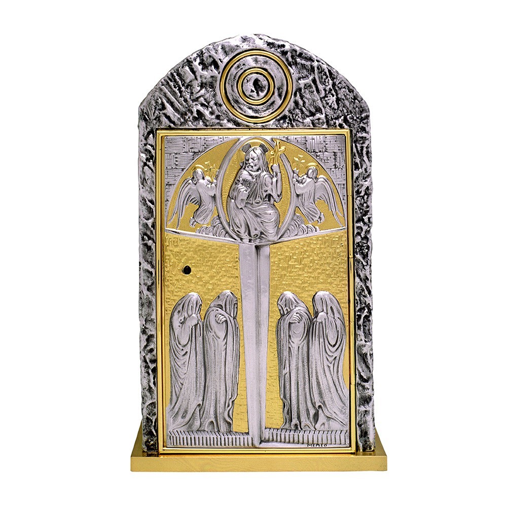 Tabernacolo in bronzo con porta bicolore finitura oro e argento. Sulla porta vi è decorato Gesù Pantocratore. Le pareti interne sono in lastre di ottone dorato. Fornito di serratura di sicurezza con re chiavi. Questo arredo sacro non contiene nikel.