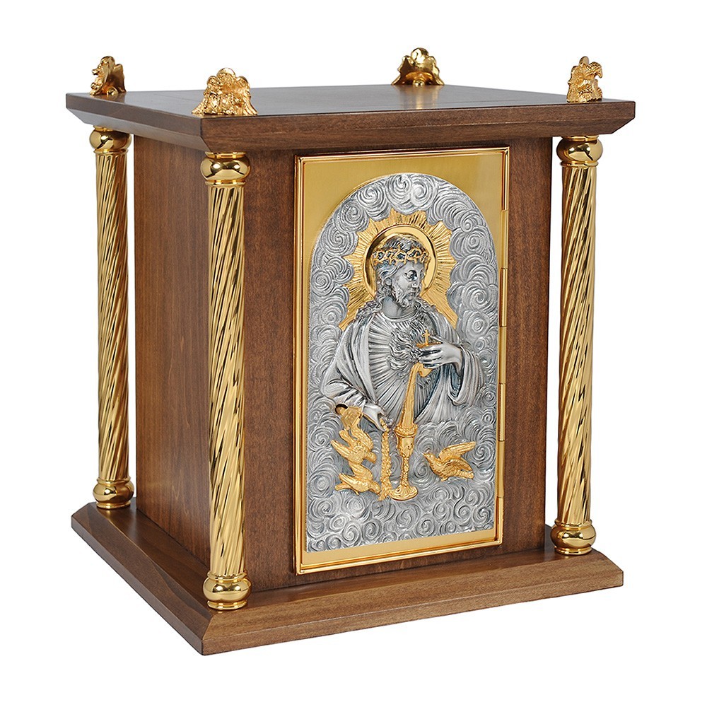 Questo tabernacolo è realizzato in legno con quattro colonne in ottone dorato. La porta è in ottone bicolore con finiture oro e argento, con immagine del Sacro Cuore di Gesù. Le dimensioni del tabernacolo sono 40x40x50 cm. La porta è alta 33 cm ed è larga 18 cm.