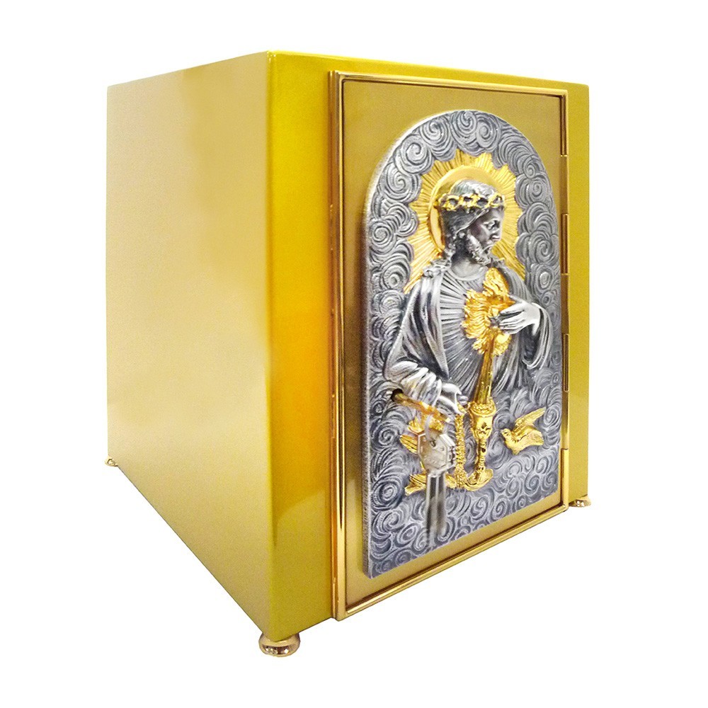 Tabernacolo da mensa di grandi dimensioni (30x30x40 cm), con Scaro Cuore di Gesù. Questo arredo sacro è interamente in ottone con finiture bicolore dorate e argentate. La porta viene fornita con una serratura a cassaforte, molto resistente.