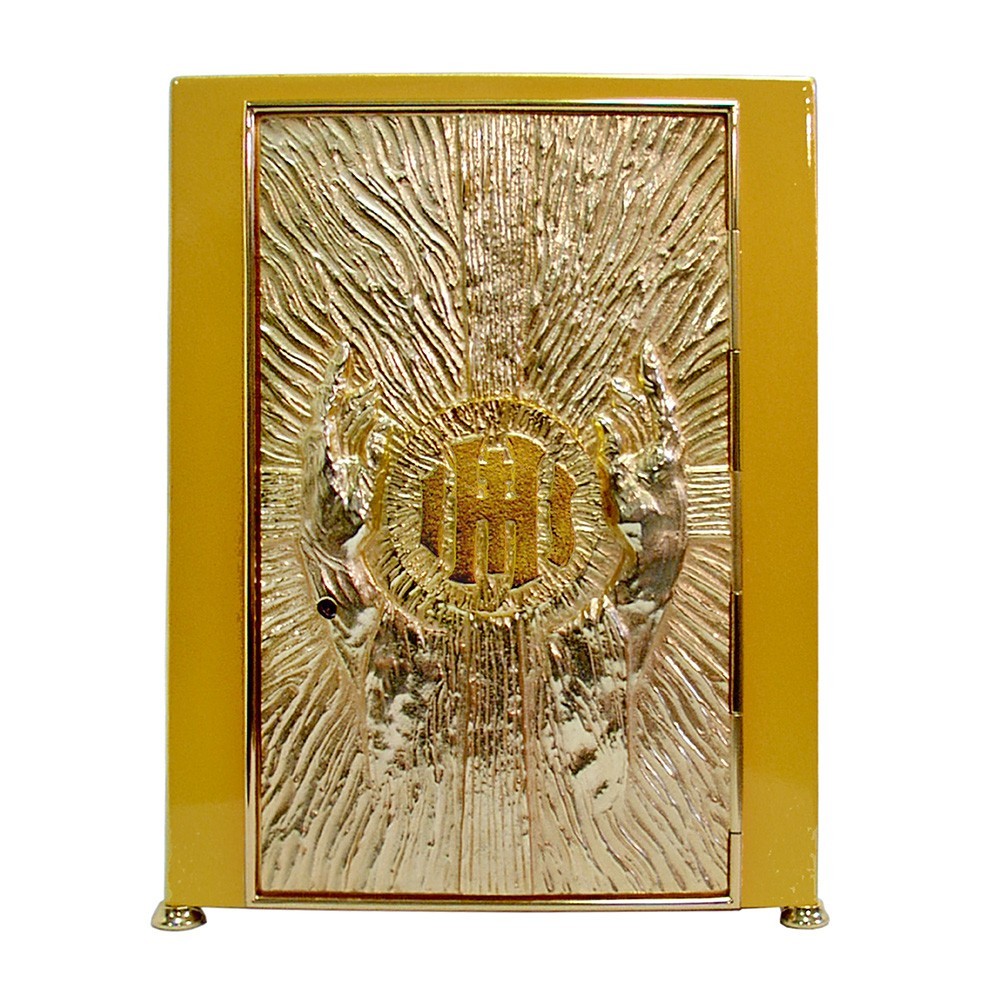 L'interno del tabernacolo è in lastre di ottone, mentre esternamente è in bronzo dorato. Viene fornito di searratura molto ressistente, con due chiavi in dotazione. Rappresenta un prodotto di alta qualità, realizzato da un'azeinda italiana.