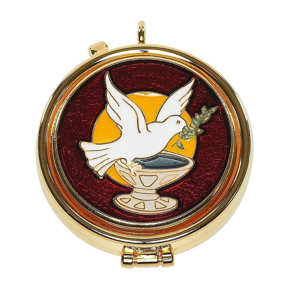 Teca portaostie in ottone dorato e placca smaltata con Colomba. Il diametro della teca è 5,4 cm.