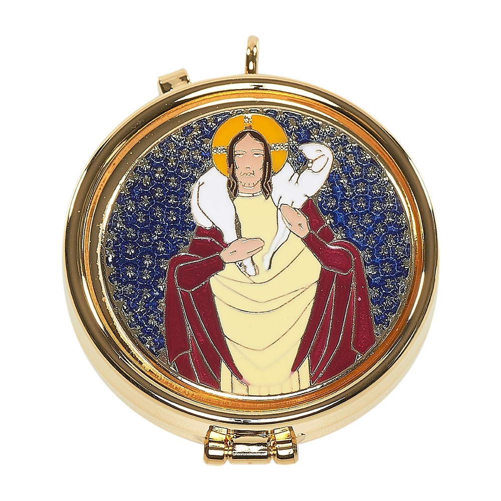 Teca eucaristica con placca smaltata CRisto su fondo blu, Ø 5.3 cm.